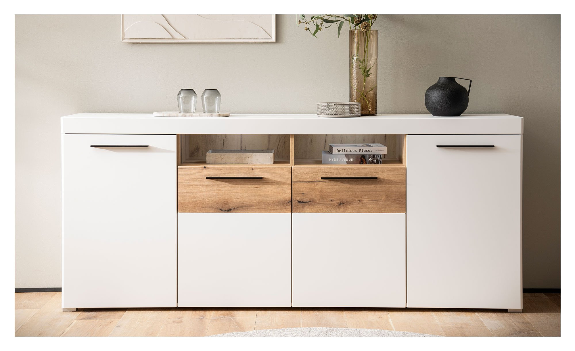 Das stilvolle Sideboard San Remo vereint praktischen Stauraum mit modernem Design und verleiht Ihrem Wohnraum auf diese Weise eine ansprechende Note.