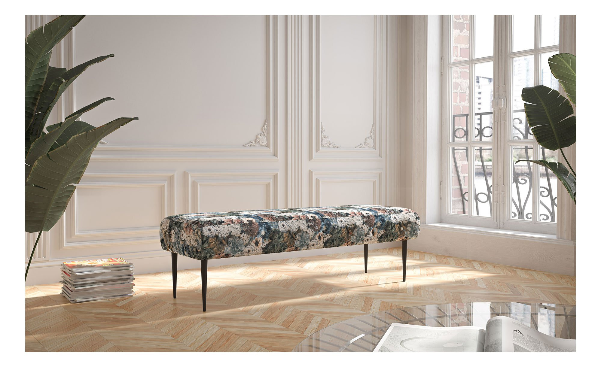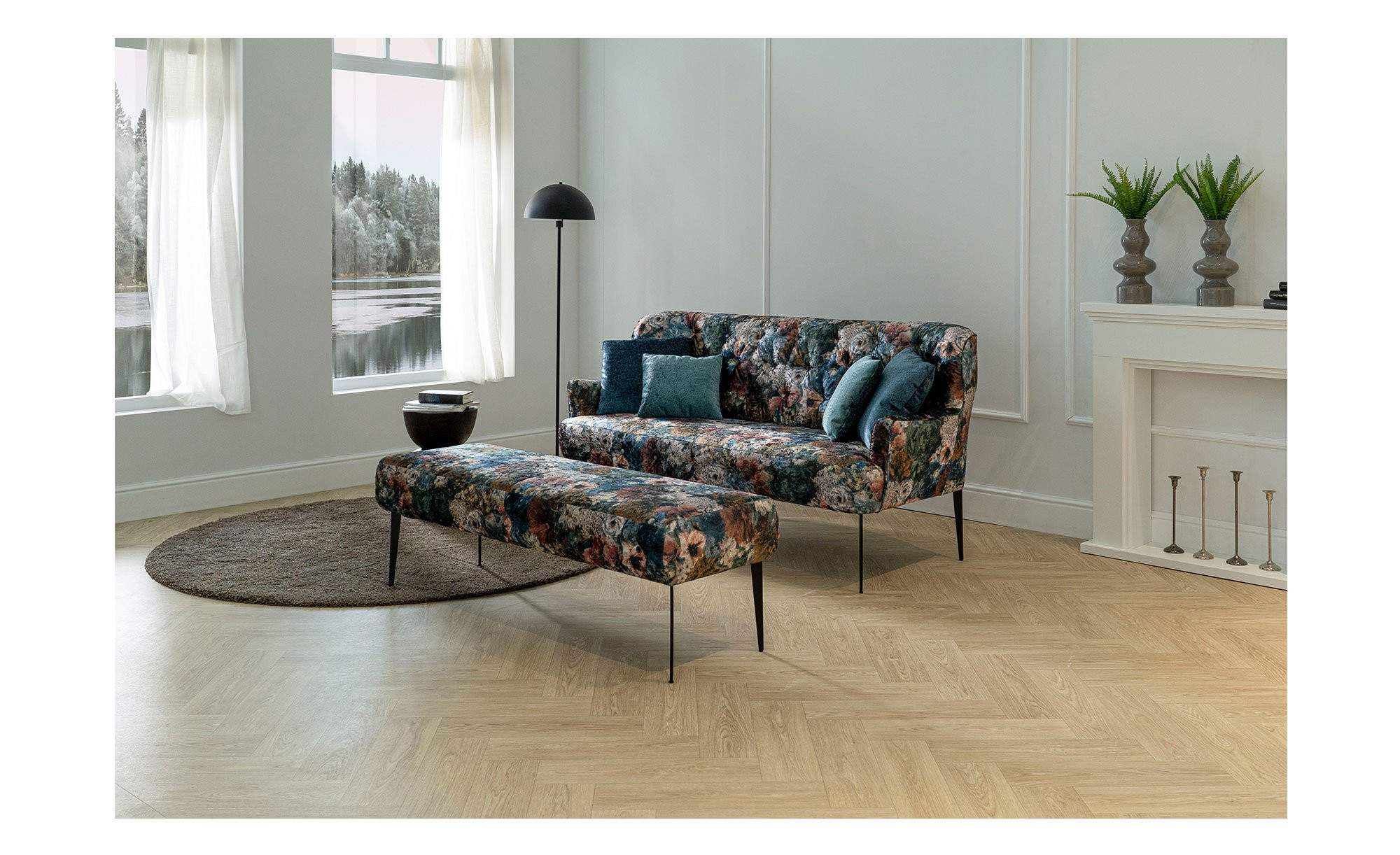 Ein aus 100 % Polyester bestehender Jacquard-Bezug in einem rose-blauen Muster umspannt das ca. 159 x 52 x 54 cm große Möbelstück. Passend dazu gibt es ein stabiles Metallgestell in stilvollem Schwarz. Im Sitz des Artikels sorgt eine hochwertige Polsterung aus PUR-Schaum für ein bequemes Sitzgefühl.
