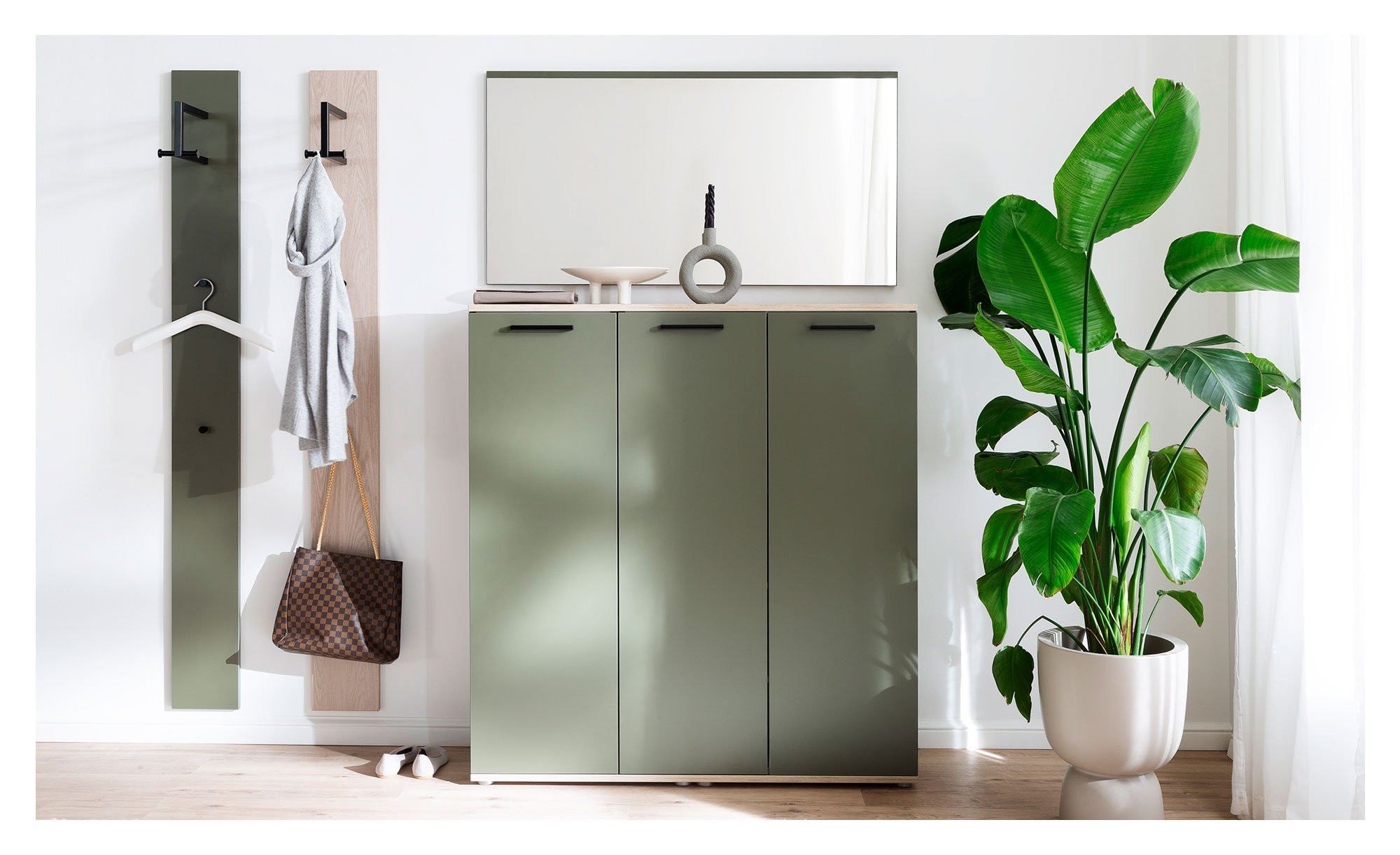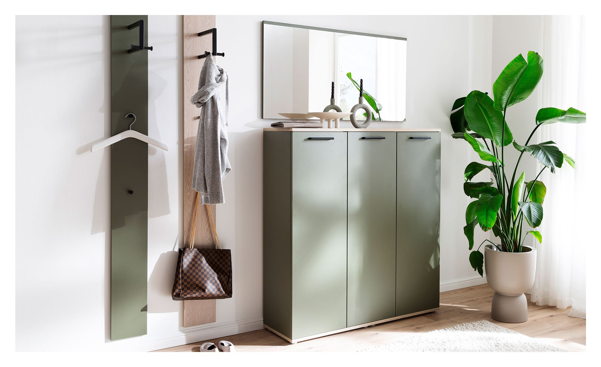 Der Artikel misst ca. 120 x 63 x 2 cm und wertet Ihren Flur auf optisch ansprechende und zugleich praktische Weise auf. Fast vollständig besteht die Front aus Spiegelglas, lediglich eine schmale Oberleiste aus Holzwerkstoff setzt sich in mattem Grün davon ab.