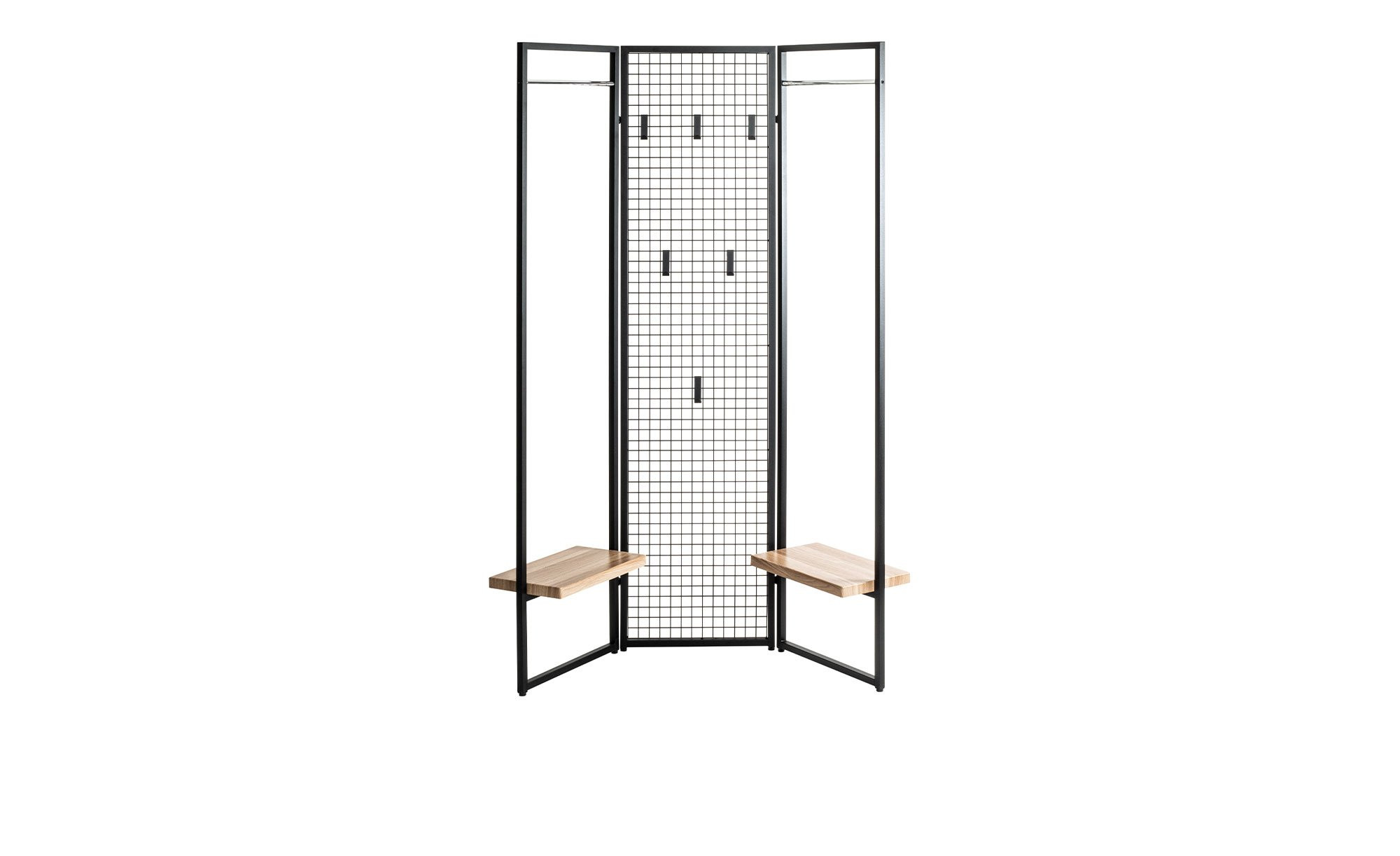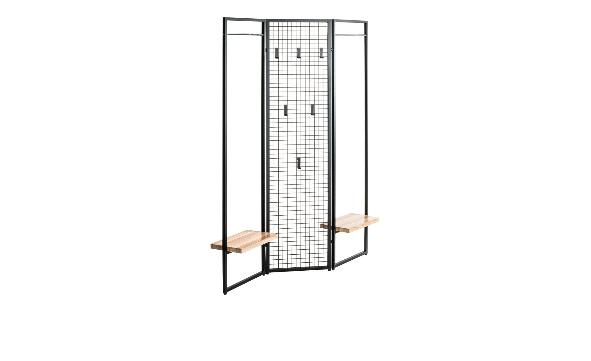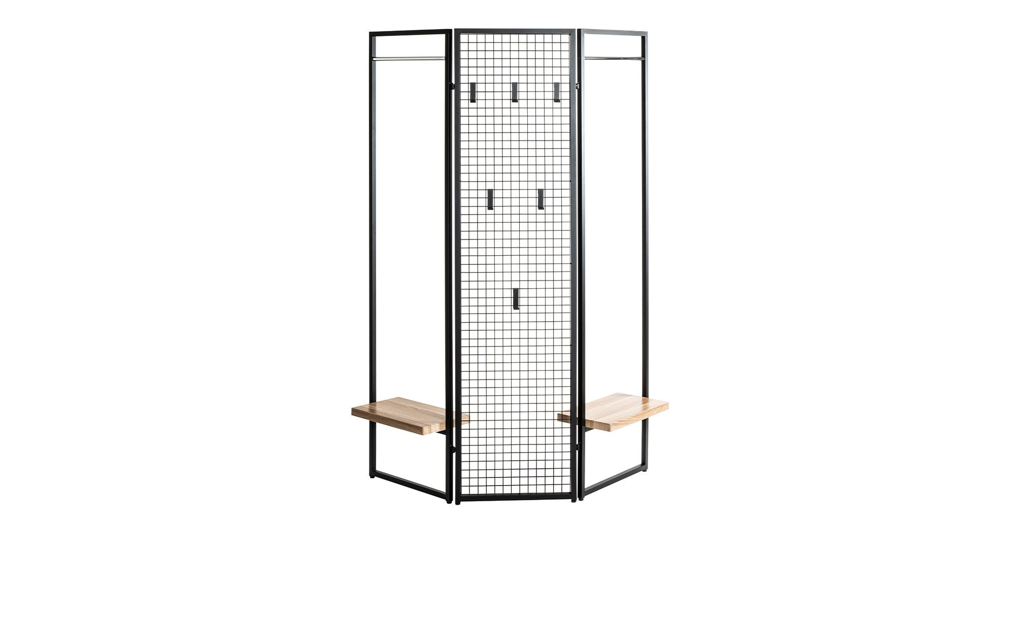 Der ca. 133 x 175 x 24 cm große Artikel besteht aus pulverbeschichtetem Stahlrohr in Schwarz. Er ist in drei jeweils ca. 43 cm breite Elemente unterteilt. Während die beiden äußeren mit je einer Kleiderstange in Chrom-Optik und Sitzbrettern ausgestattet sind, findet sich am mittleren ein integriertes Gitter mit sechs variablen Garderobenhaken.