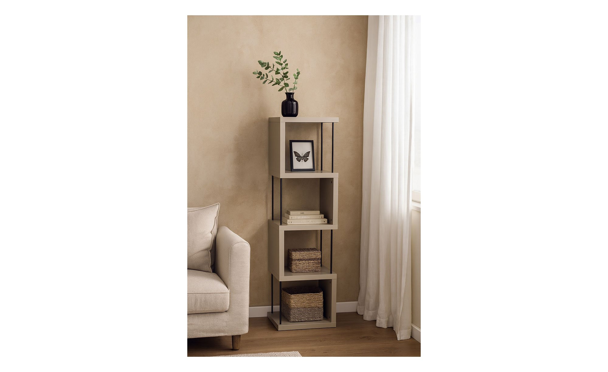 Vier offene Fächer bieten flexible Möglichkeiten zur Organisation von Büchern, Dekoration oder Alltagsgegenständen. Jede Seite wird durch zwei schwarze Metallstäbe ergänzt, die nicht nur stilvolle Akzente setzen, sondern auch die Stabilität des Regals erhöhen.