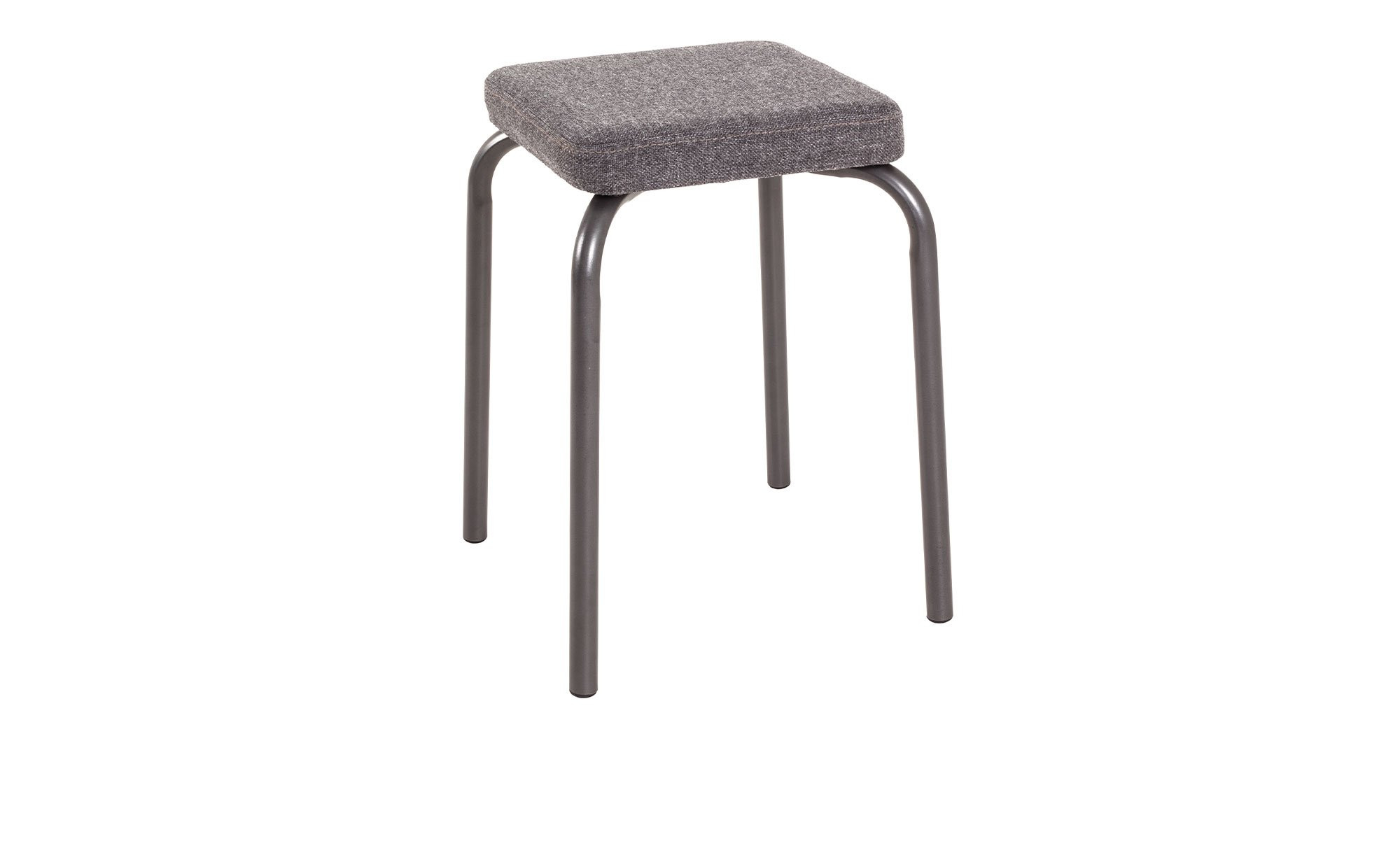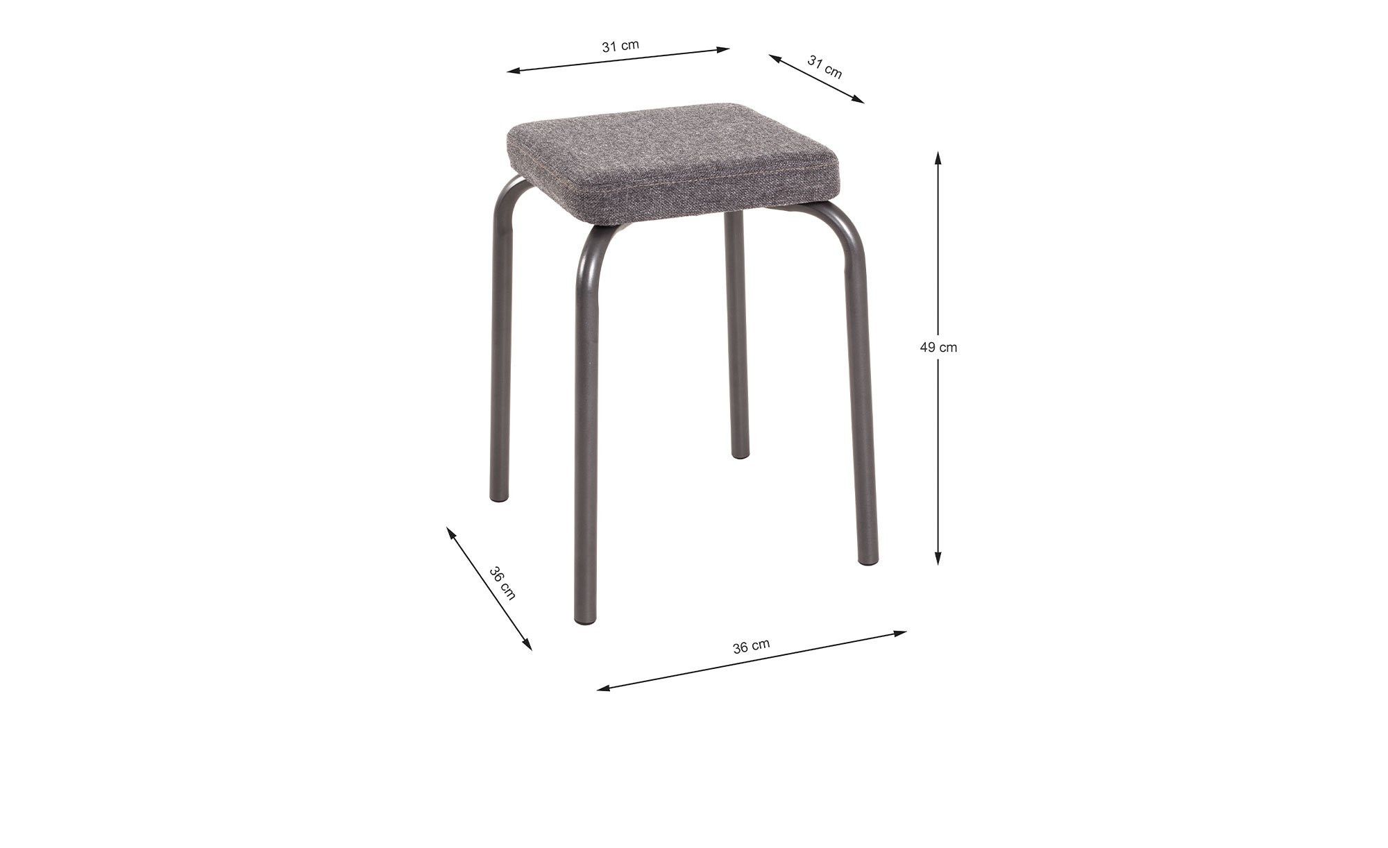 Der Artikel misst ca. 36 x 48 x 36 cm und ist mit vier im Ton Gunmetal lackierten Füßen versehen. Diese bestehen aus Stahlrohren mit einem Durchmesser von ca. 25 mm. Sie tragen die ca. 31 x 31 cm umfassende Sitzfläche mit einer Polsterung aus 100 % Schaumstoff (PVC). Der graue Stoffbezug aus Polypropylen rundet die Erscheinung ab.