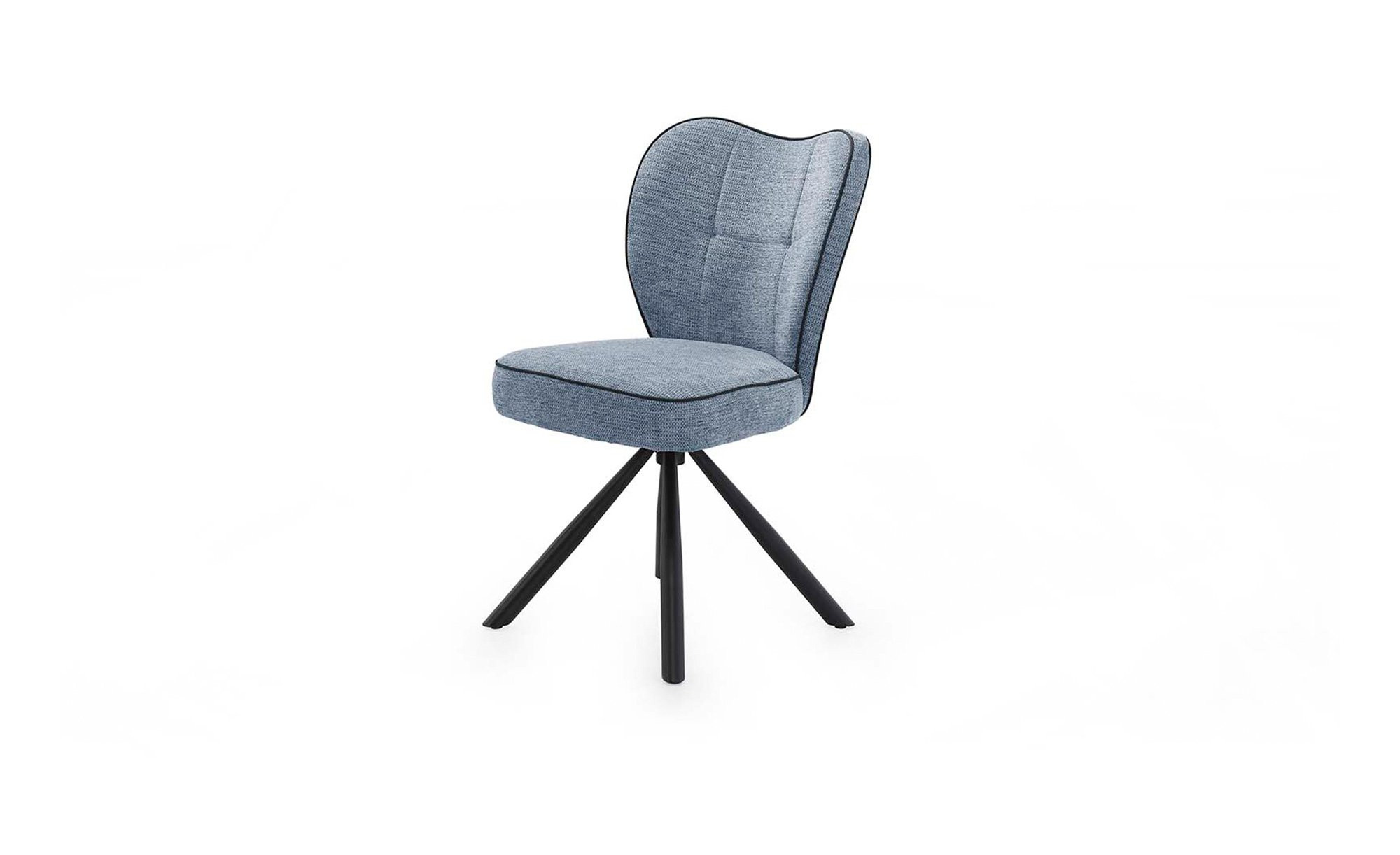 Bezogen mit einem blauen Webstoff aus 100 % Polyester, springt der ca. 48 x 89 x 61 cm große Stuhl unmittelbar ins Auge. Hinzu kommen ein umlaufender Keder und das schwarze Stativgestell aus Metall mit vier Füßen.