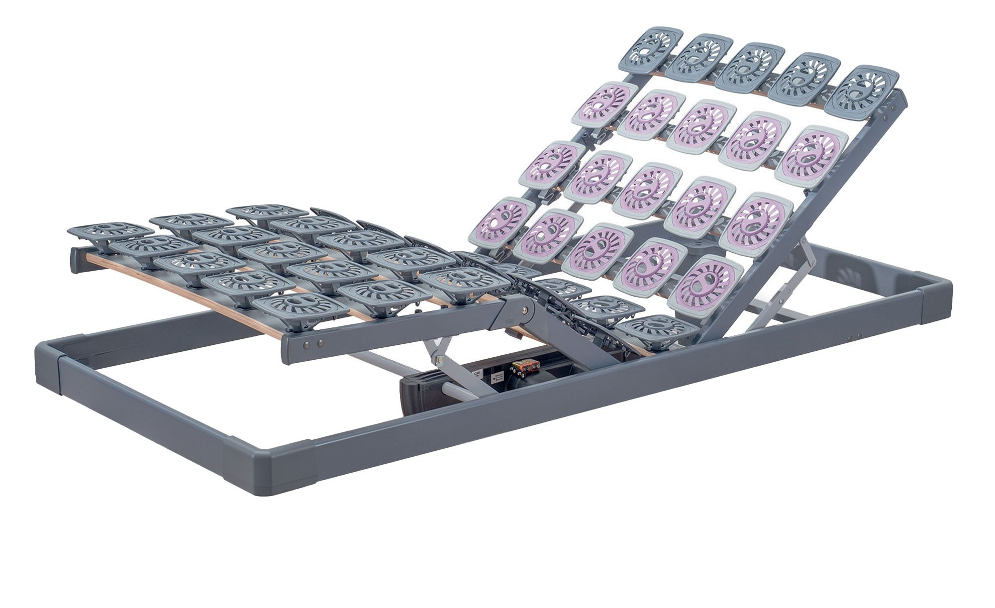 Für eine punktgenaue Anpassung an Ihre Körperzonen ist der Rahmen mit drei Reihen samt fixierbarer Schulterabsenkung, einer Schulterzone und einer Beckenzone ausgestattet. Die Kopf- und Fußteile sind 2-motorisch verstellbar und lassen sich komfortabel per Funkfernbedienung oder Bluetooth steuern. Zusätzlich verfügt der Systemrahmen Discovery Premium Flex 100 x 200 cm über eine Notabsenkung.
