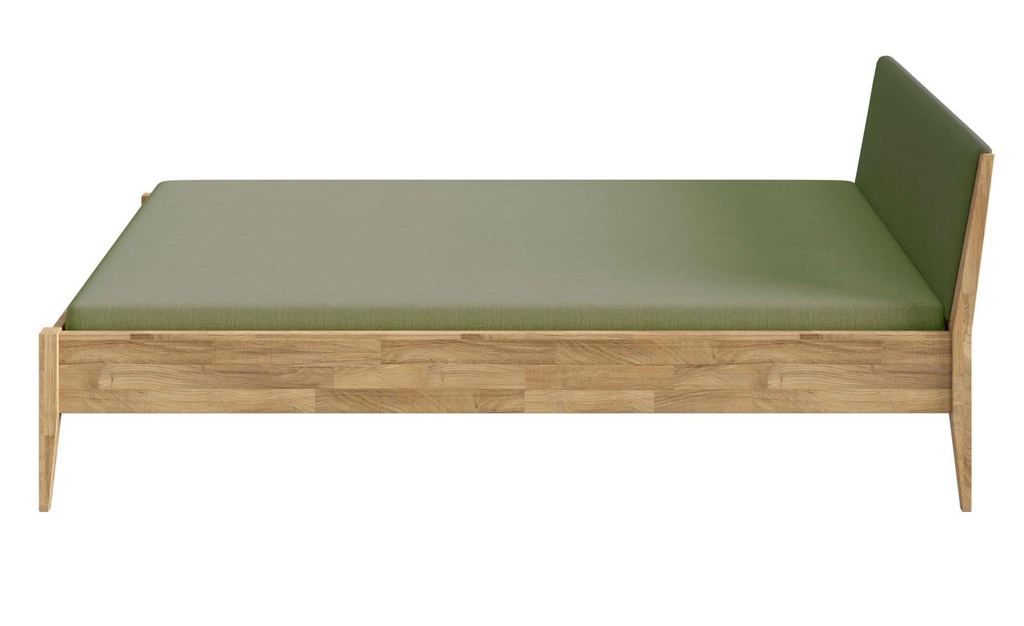 Das ca. 127 x 80 x 214 cm große Möbelstück verfügt über ein Gestell aus massiver Eiche und ein gepolstertes Kopfteil. Letzteres ist mit einem Stoff in der Farbe Nordic Green bezogen.