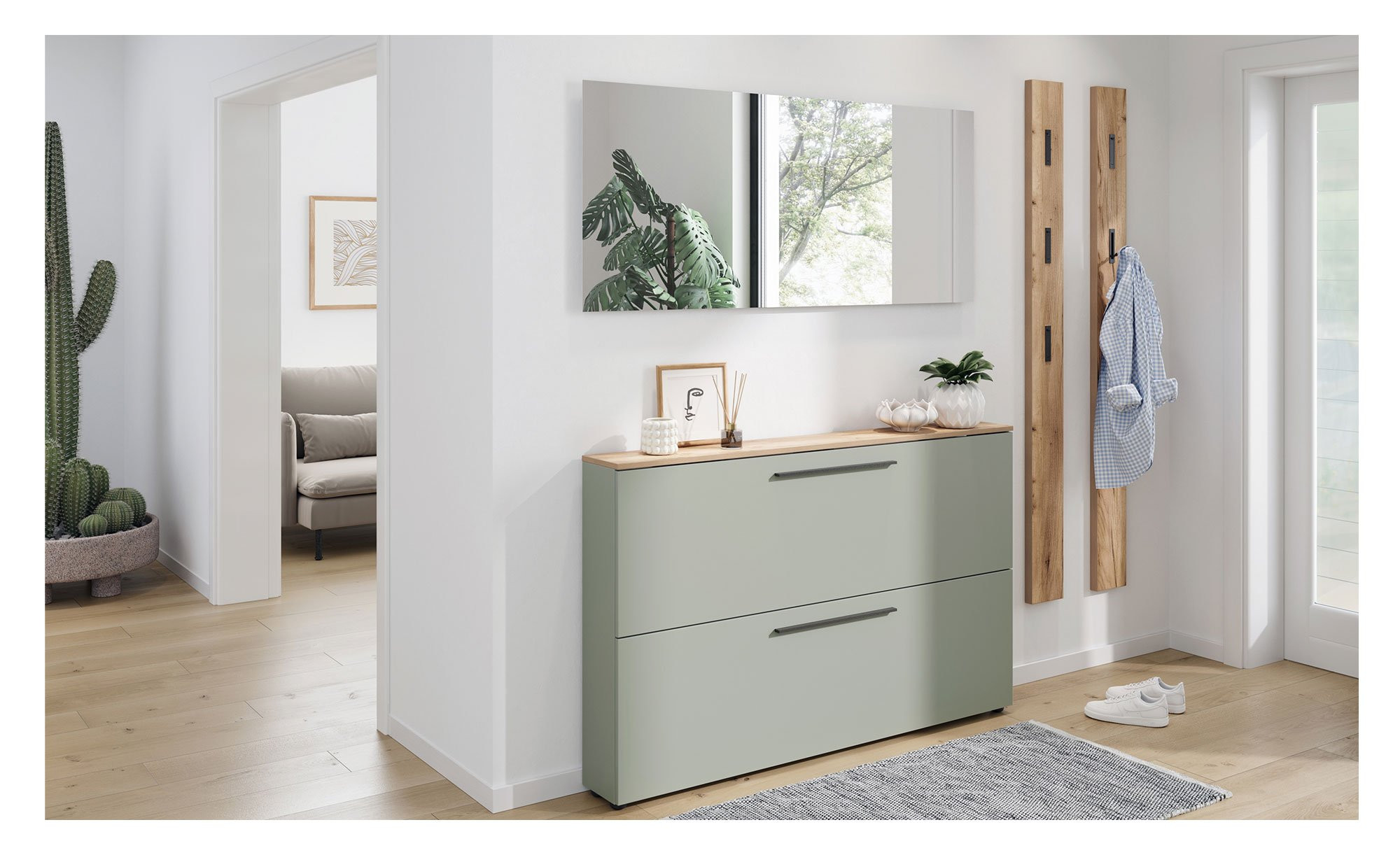 Der ca. 140 x 60 x 3 cm große Artikel verfügt als Basis über eine schwarze Trägerplatte mit widerstandsfähiger Melaminharzbeschichtung. Da die Platte zurückspringend gestaltet ist, entsteht eine stilvolle Schattenfuge. Die Front des Möbelstücks wird ansonsten komplett von einer großzügigen Fläche aus Spiegelglas eingenommen.