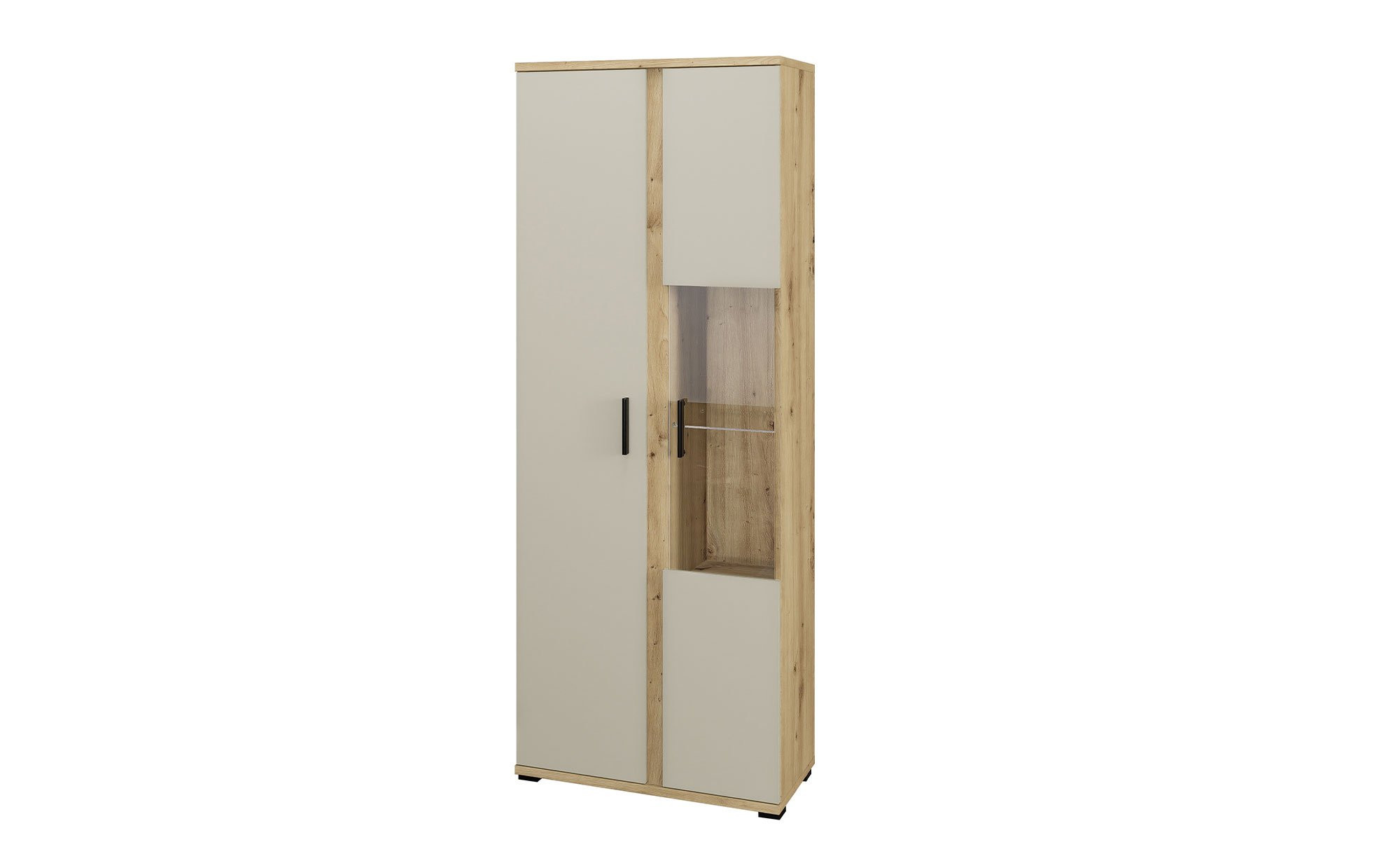 Das ca. 75 x 196 x 35 cm große Möbelstück besteht aus robustem Holzwerkstoff. Während Sie an der Vorderseite ein edler Kaschmir-Ton erwartet, sind der Korpus und einige Absetzungen im Dekor Artisan Eiche gehalten. Sowohl die Stangengriffe aus Kunststoff als auch die Kunststofffüße sind schwarz.