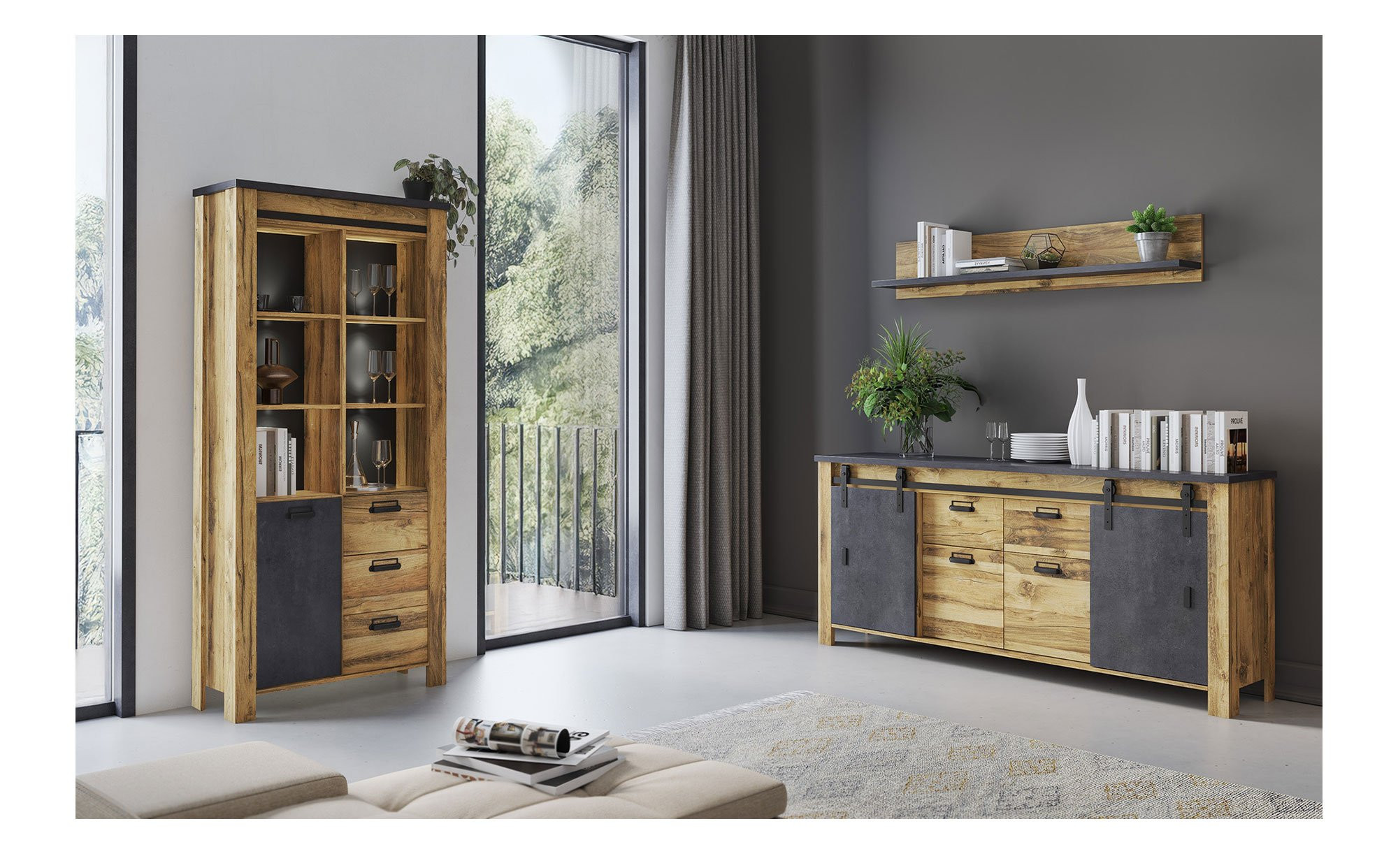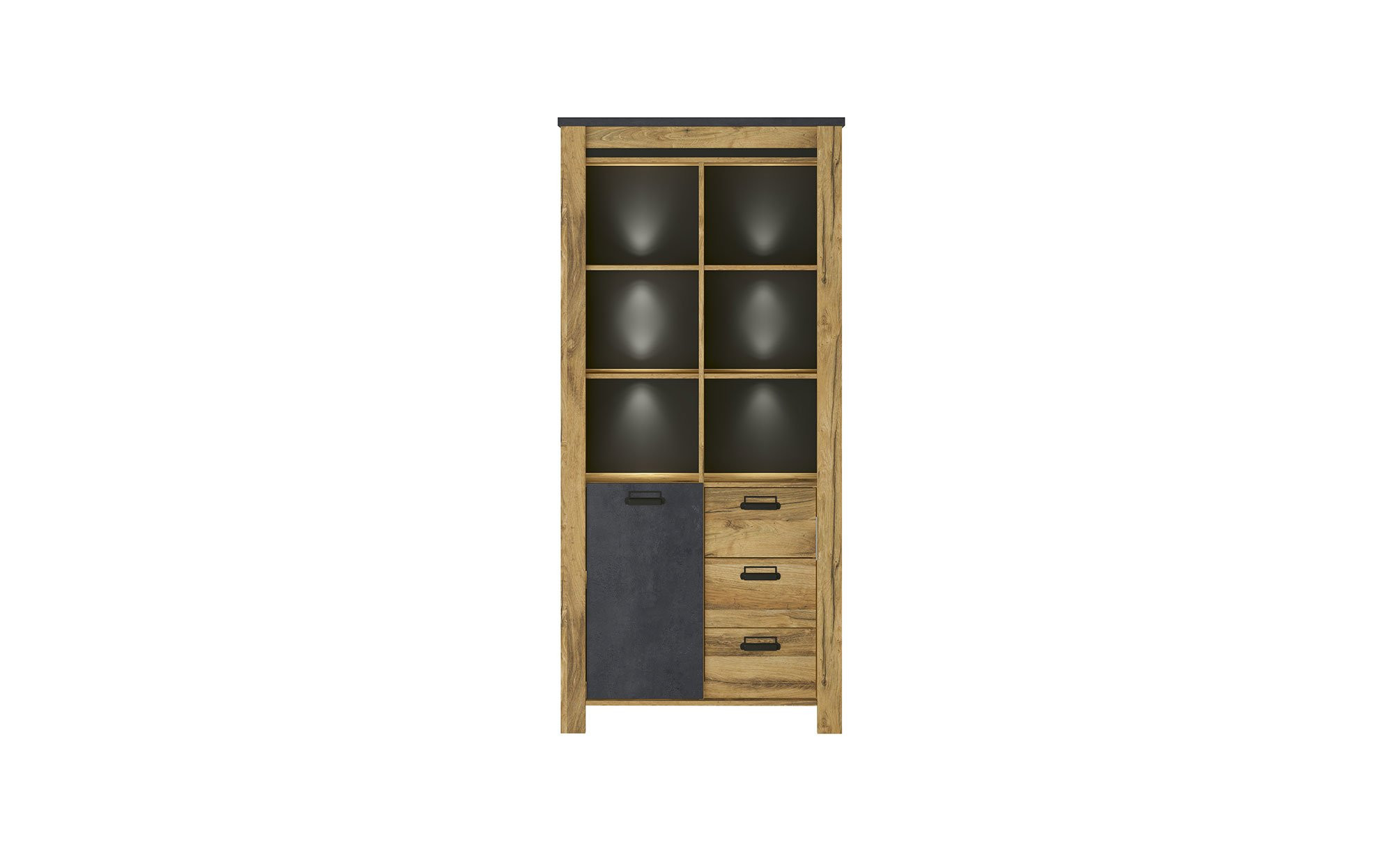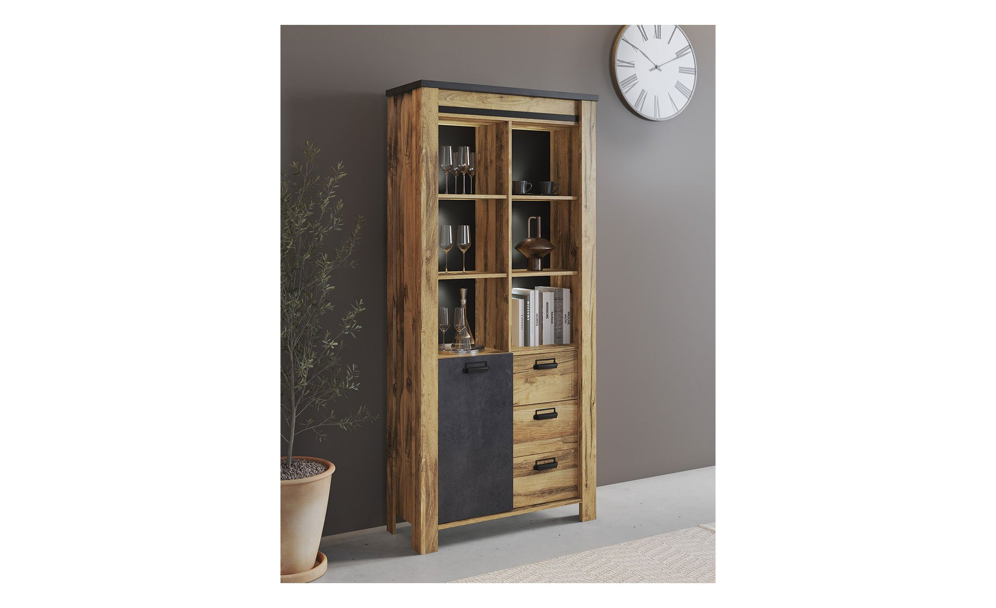 Mit seiner außergewöhnlichen Optik bringt die Vitrine Yola eine raue Ursprünglichkeit in Ihren Wohnbereich.
