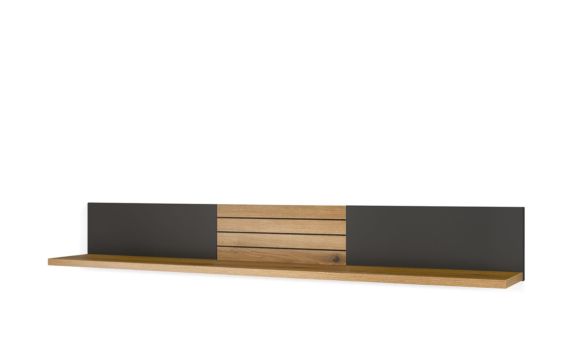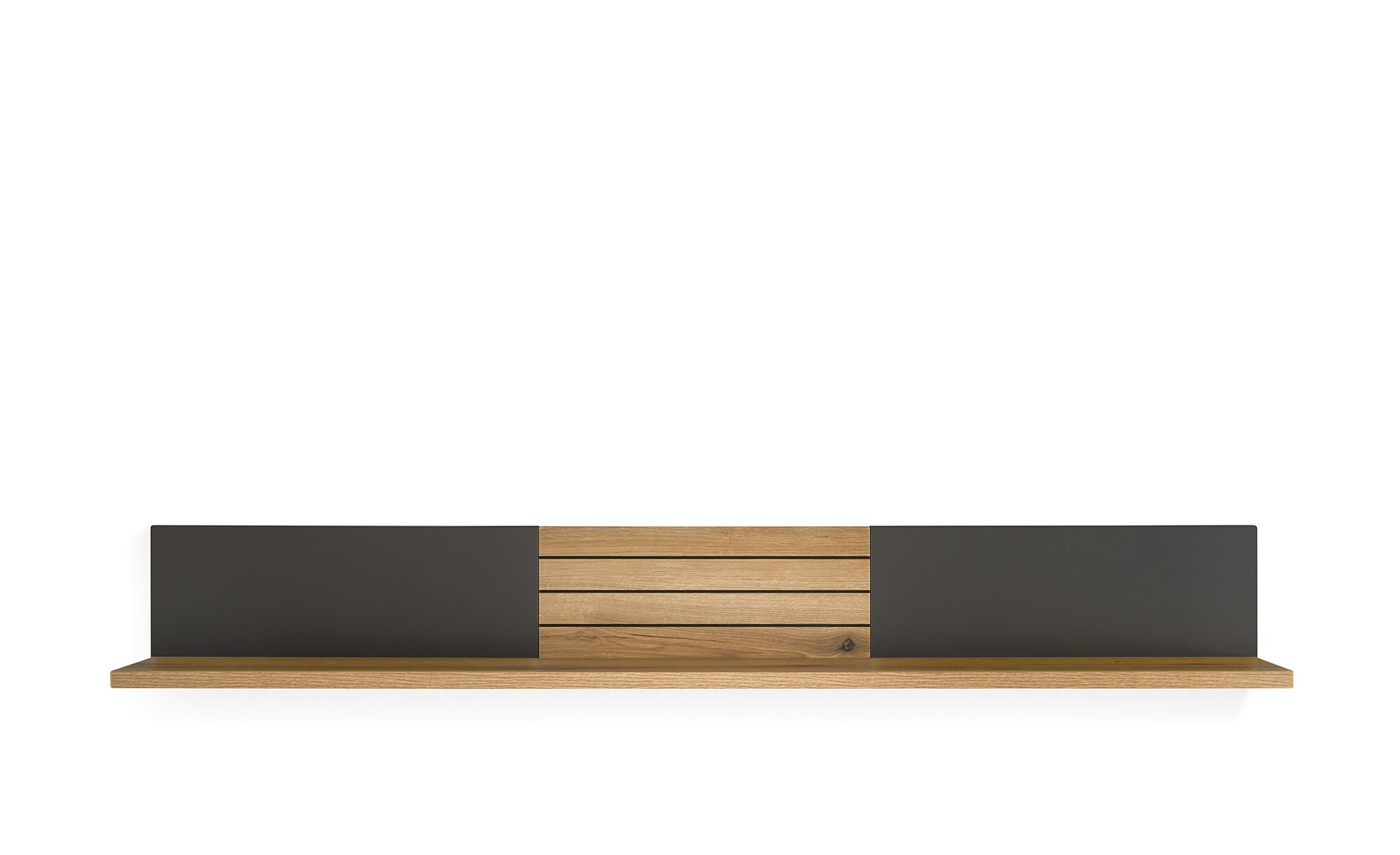 Der ca. 150 x 21 x 22 cm große Artikel aus Holzwerkstoff besticht im edlen Farbton Anthrazit, der eine stilvolle Basis bietet. Eine Absetzung aus hochwertiger Eiche-Nachbildung setzt einen natürlichen Akzent und verleiht dem Möbelstück eine warme Ausstrahlung. Dank der Melaminharzbeschichtung ist das Regal zudem optimal vor Verschleiß geschützt.