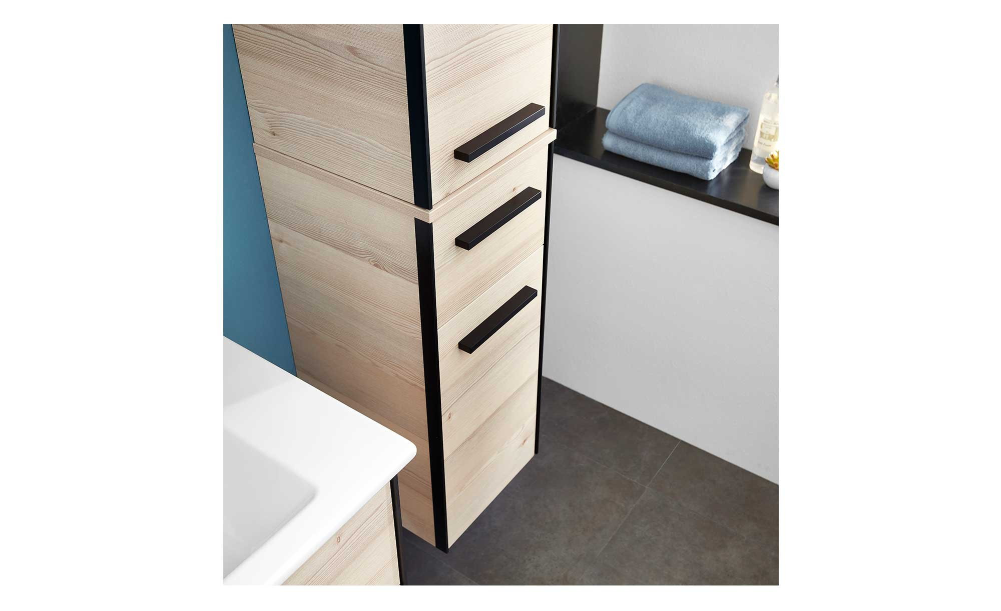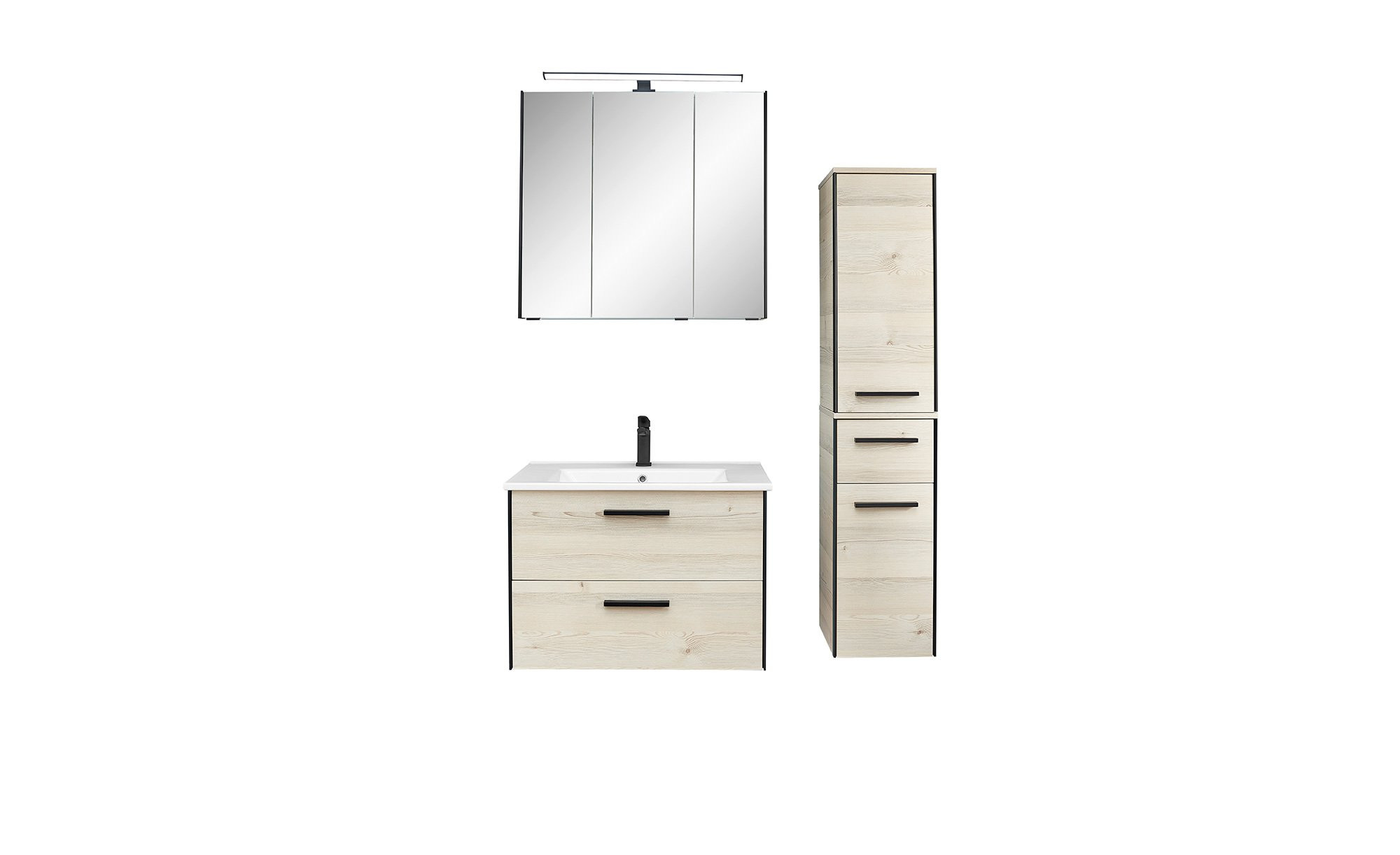 Sowohl der Korpus als auch die Front des ca. 30 x 70 x 33 cm großen Möbels wurden in einer Polar Pinie quer Nachbildung gestaltet. Hinzu kommen ein schwarzes L-Profil am Korpus sowie matt-schwarze Griffe.