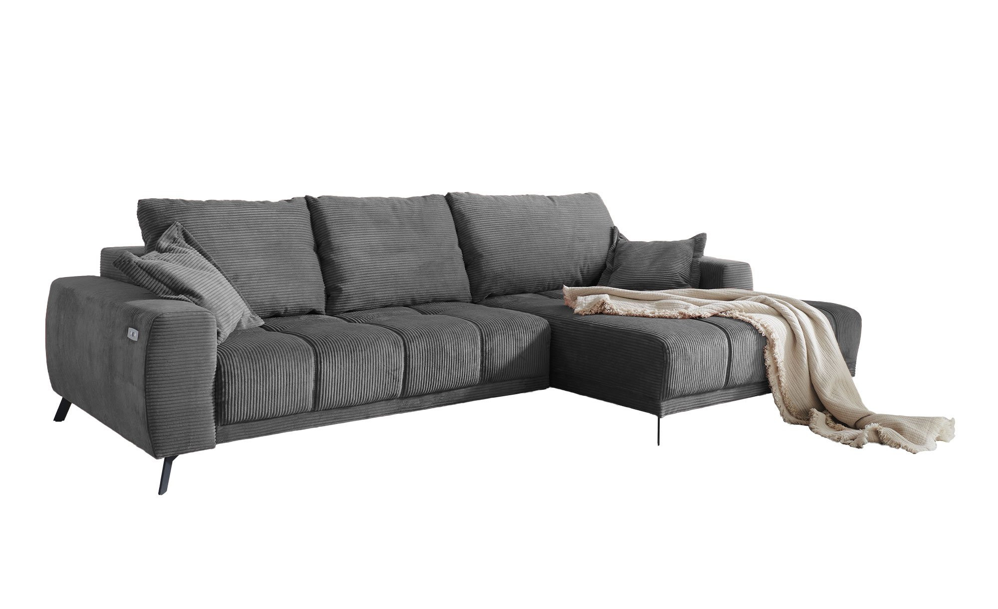 Das ca. 306 x 91 x 177 cm große Möbelstück begeistert mit einem dunkelgrauen Cord-Stoffbezug aus 100 % Polyester. Seine kuschelige Haptik und die beiden mitgelieferten ca. 57 x 54 cm großen Flatterkissen sowie drei Rückenkissen im selben Material runden den Komfort ab. Schwarze Metallfüße setzen zudem einen gelungenen optischen Akzent.