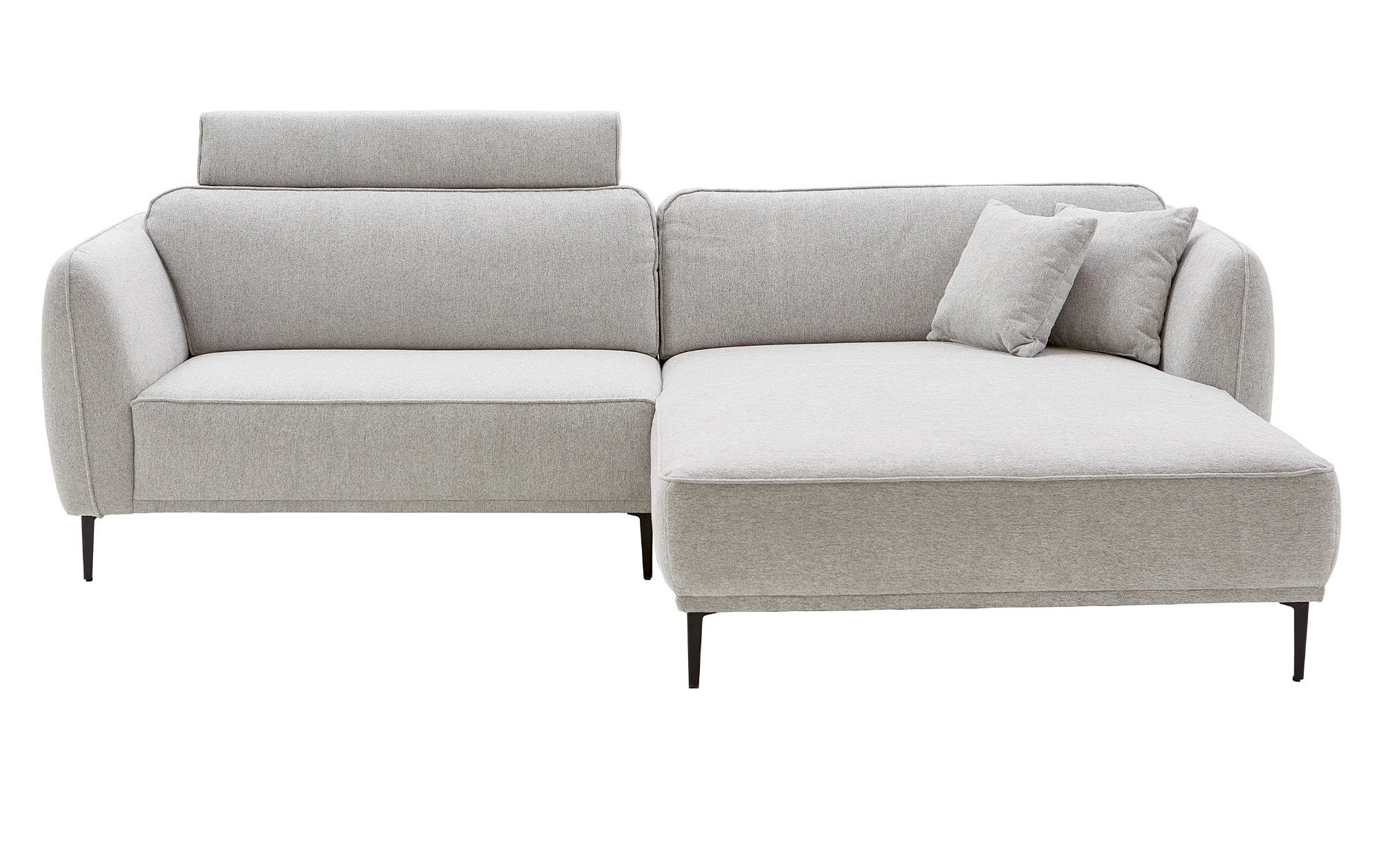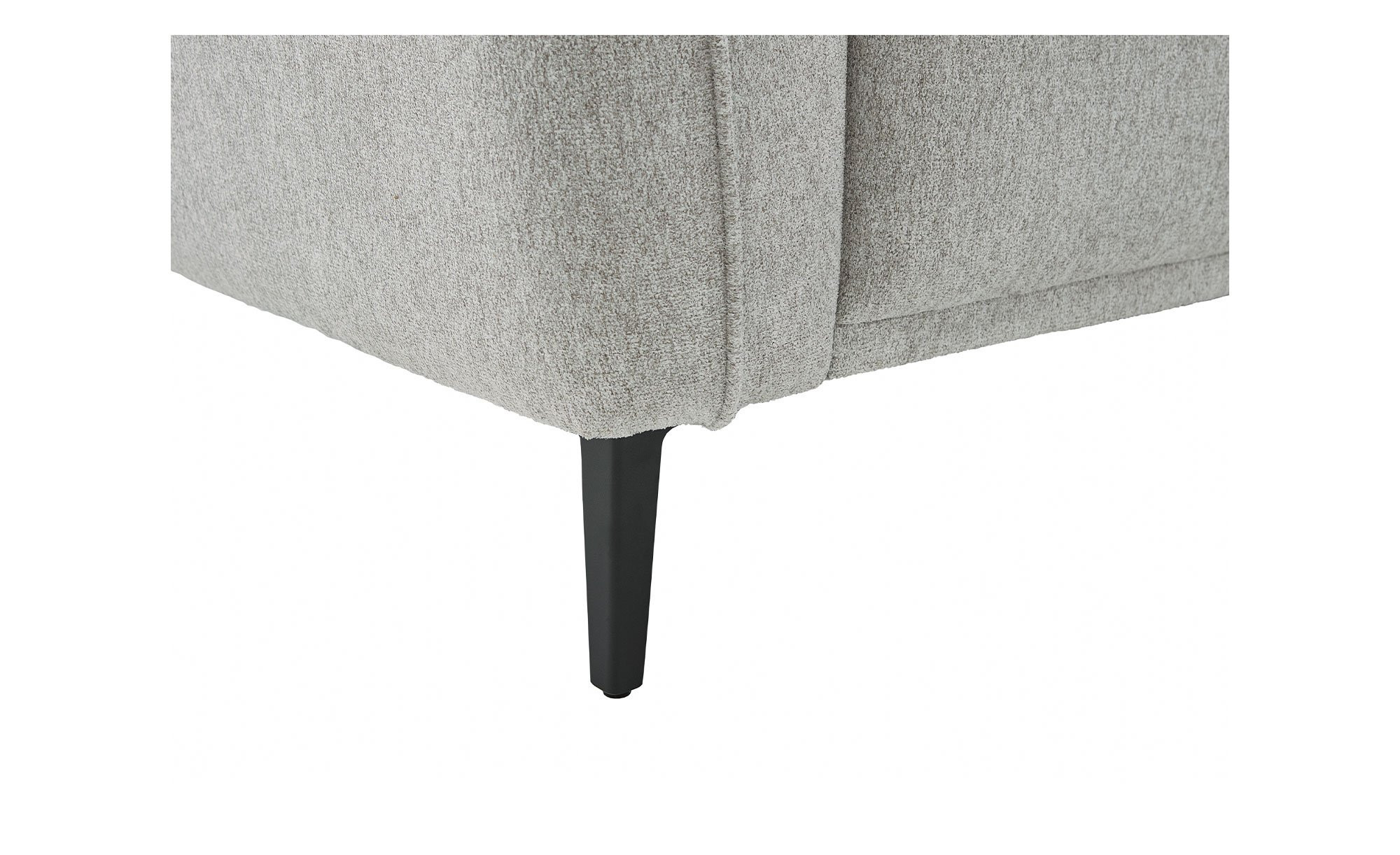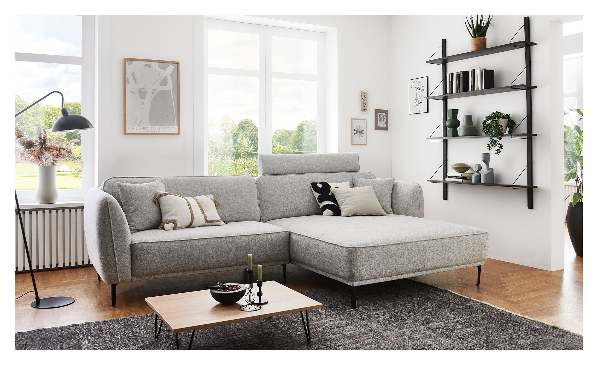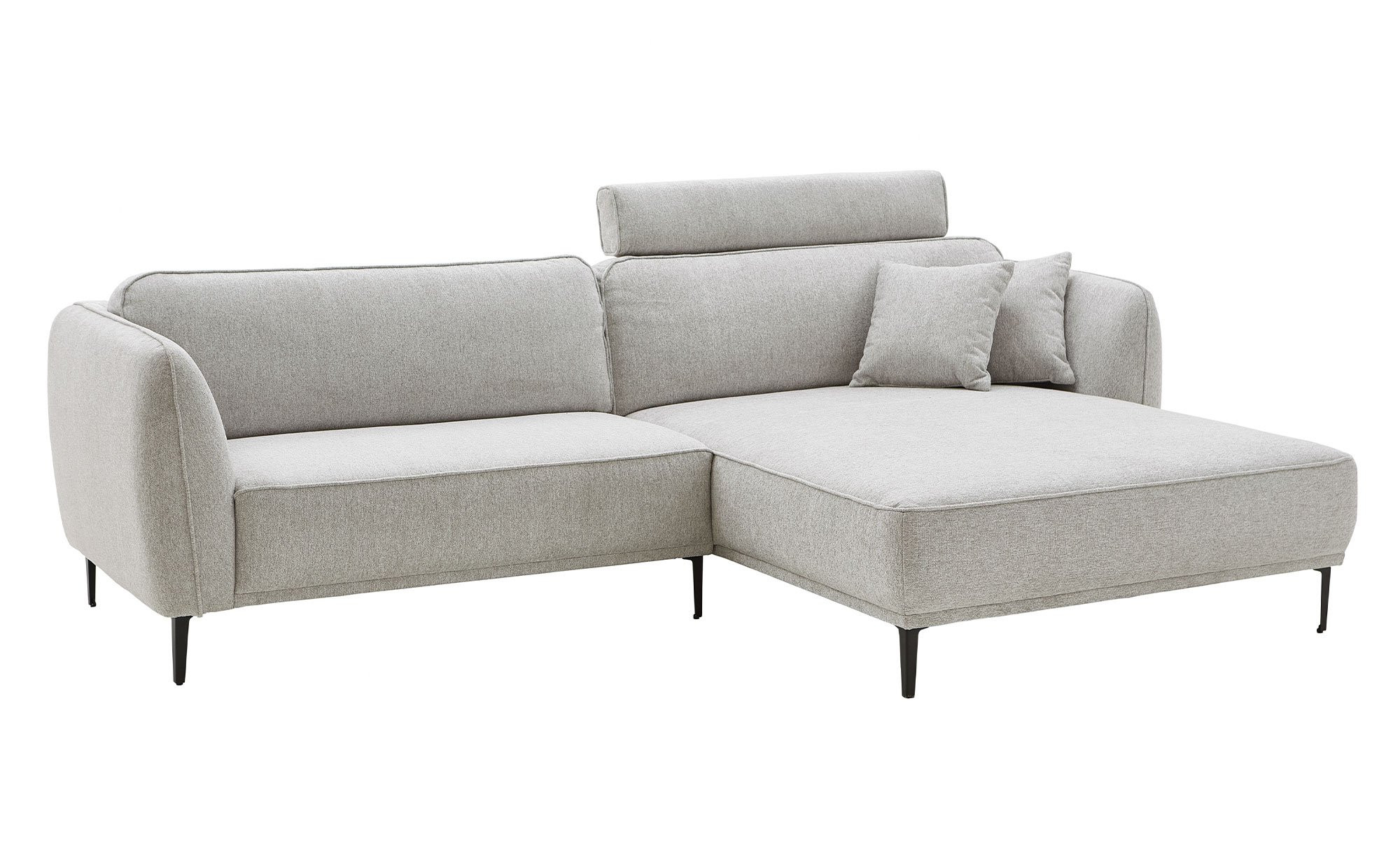Ein silberner Stoffbezug aus 100 % Polyester umschließt das rechtsseitig ausgerichtete Möbelstück inklusive seines Rückens. Bei der Platzierung sind Sie also vollkommen frei.