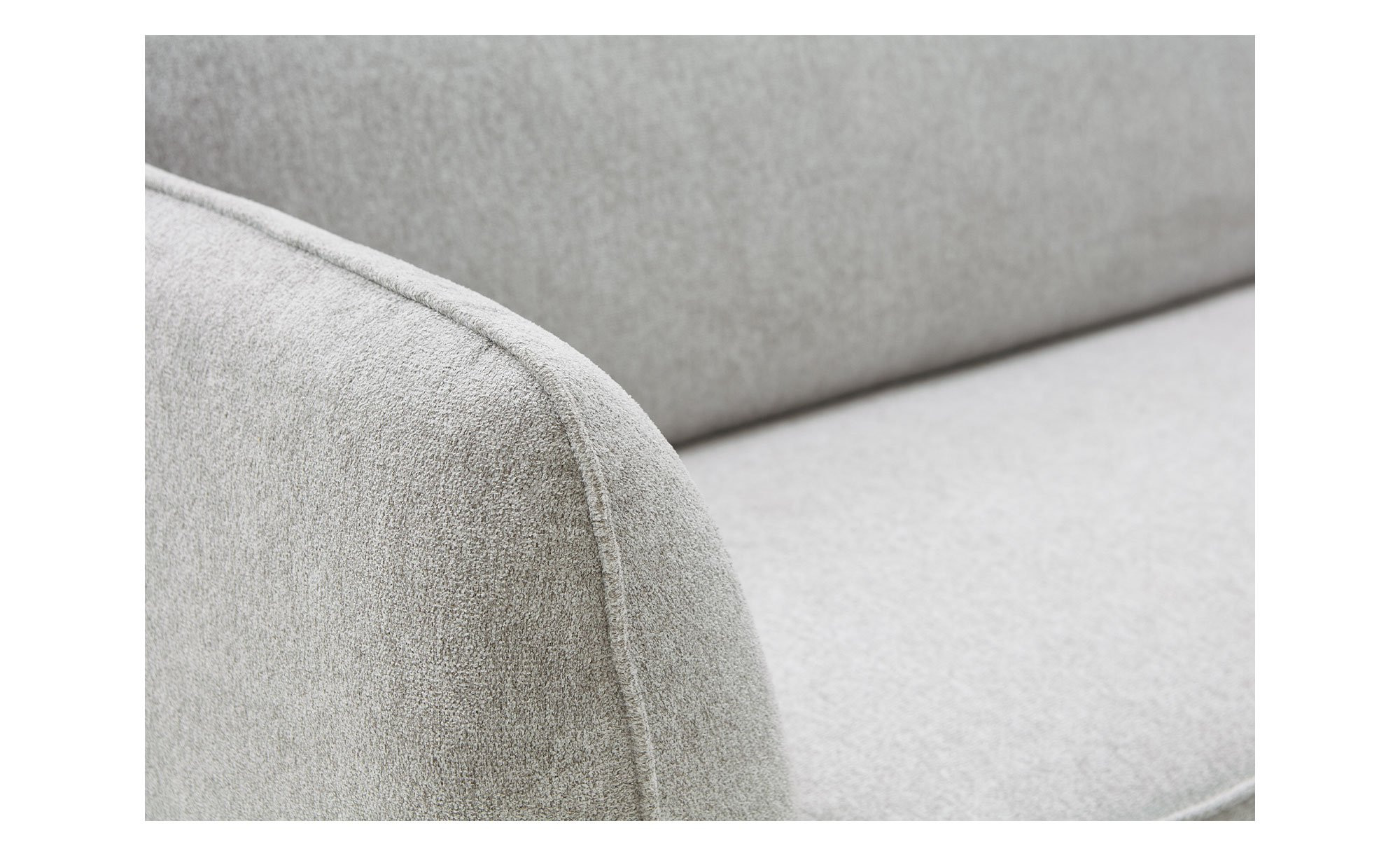 Auch die beiden mitgelieferten Zierkissen sind mit dem genannten Material bezogen. Einen gelungenen Kontrast setzen ca. 16 cm hohe Metallfüße in Schwarz.
