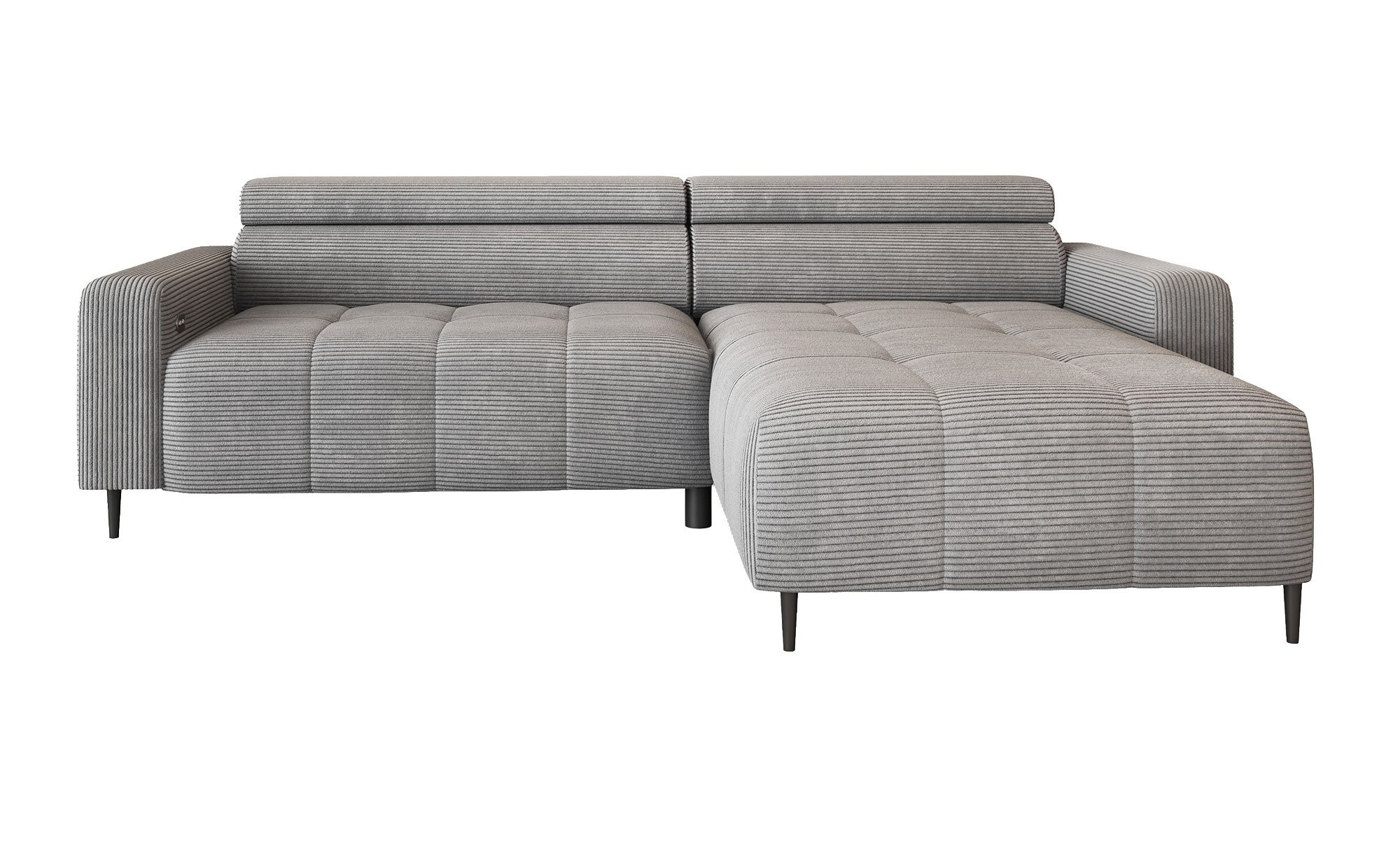 Das ca. 256 x 97,5 x 181 cm große Sofa ist rechtsseitig ausgerichtet und mit einem Stoff in Hellgrau bezogen, der auch den Rücken umfasst. Dadurch lässt es sich vollkommen flexibel im Raum platzieren. Filigrane Kunststofffüße in Schwarz mit einer Höhe von ca. 12 cm sorgen für einen stabilen Stand, ohne sich optisch in den Vordergrund zu drängen.