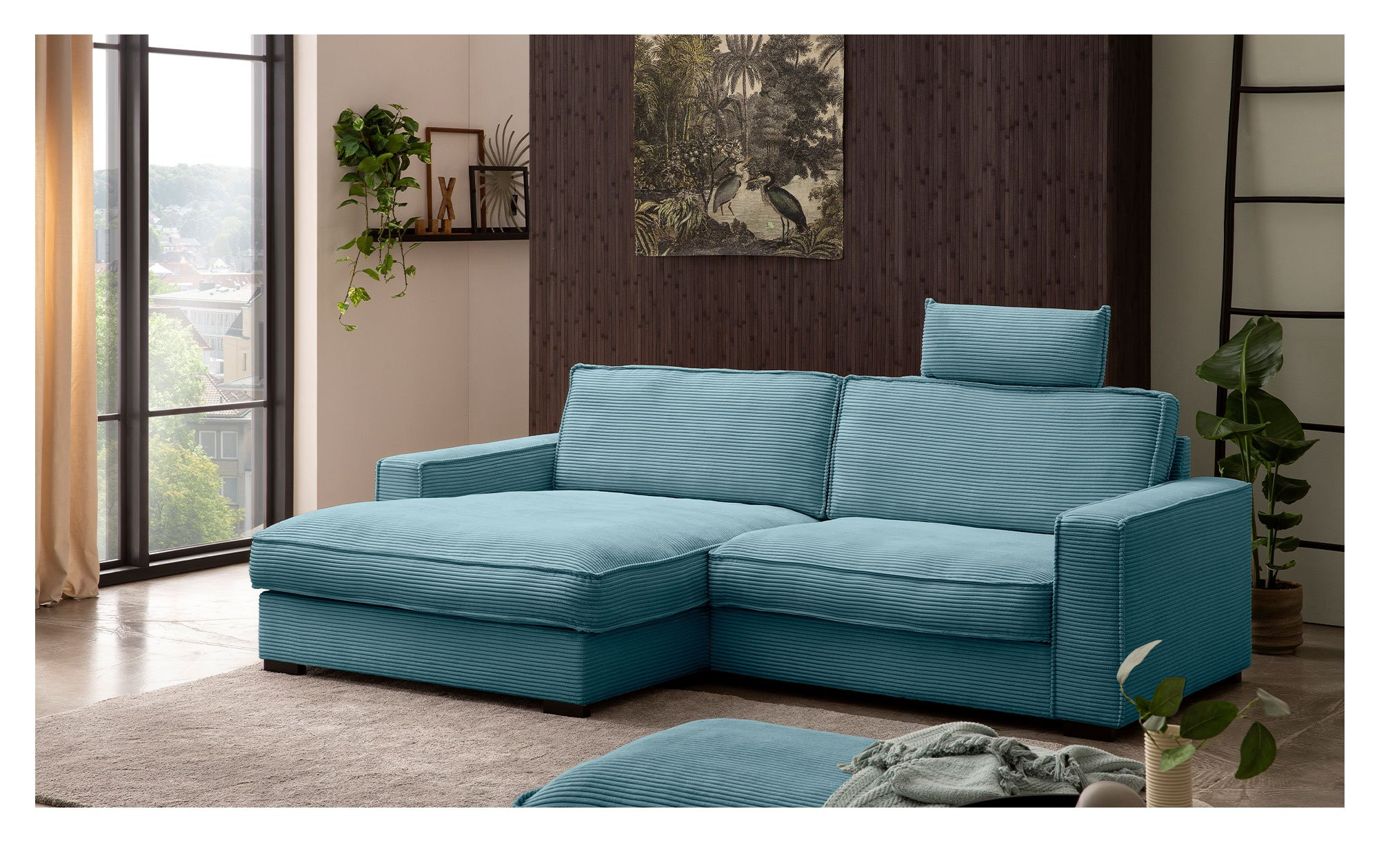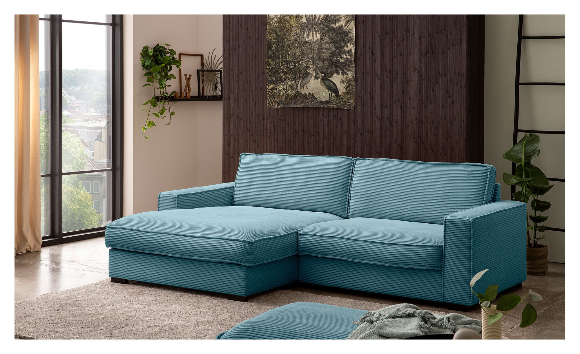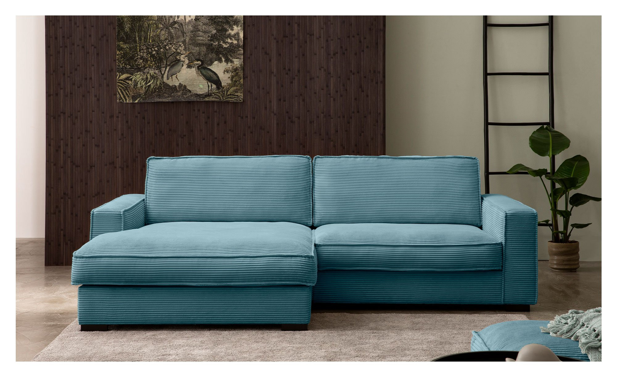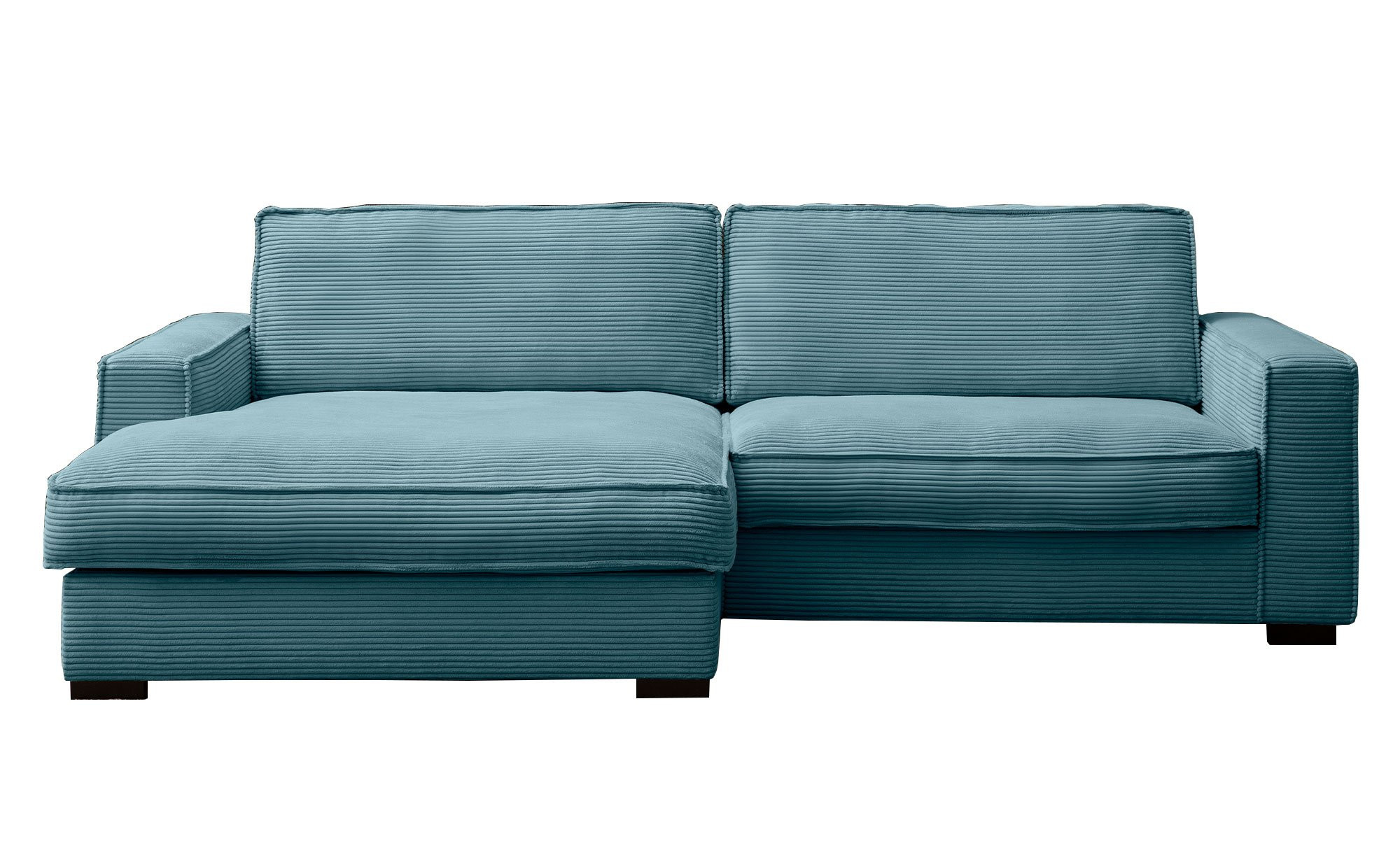 Das ca. 244 x 82 x 157 cm große Möbelstück ist mit einem kuscheligen Cordstoff in einem frischen Türkisblau bezogen, der sich auch an der Rückseite wiederfindet. Somit können Sie den Artikel flexibel im Raum platzieren. Zwei bequeme Rückenkissen sind inklusive, die stabilen Holzfüße in Wenge runden das ansprechende Erscheinungsbild ab.