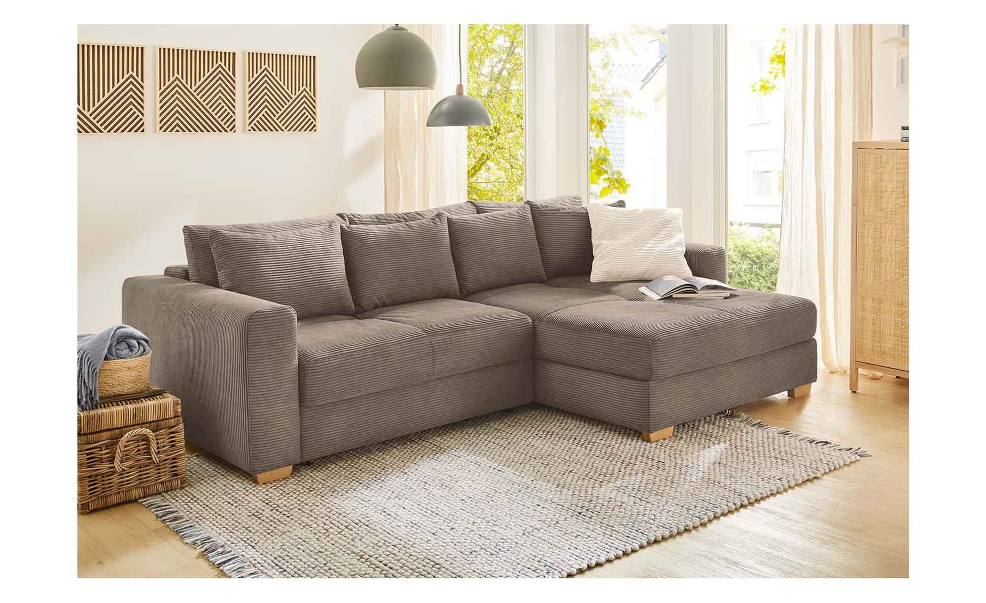 Die Wohnlandschaft Karolina (ca. 288 x 86 x 186 cm) begeistert durch ihren weichen Cordbezug aus 100 % Polyester in Taupe. Drei mitgelieferte Rückenkissen sowie vier mittelgroße Kissen greifen den Farbton auf, während das kleine Fluppy-Kissen in Beige einen stilvollen Kontrast setzt. Dank des echt bezogenen Rückens können Sie das Sofa flexibel im Raum platzieren. Ca. 5 cm hohe Füße aus massiver Eiche runden das elegante Gesamtbild ab.