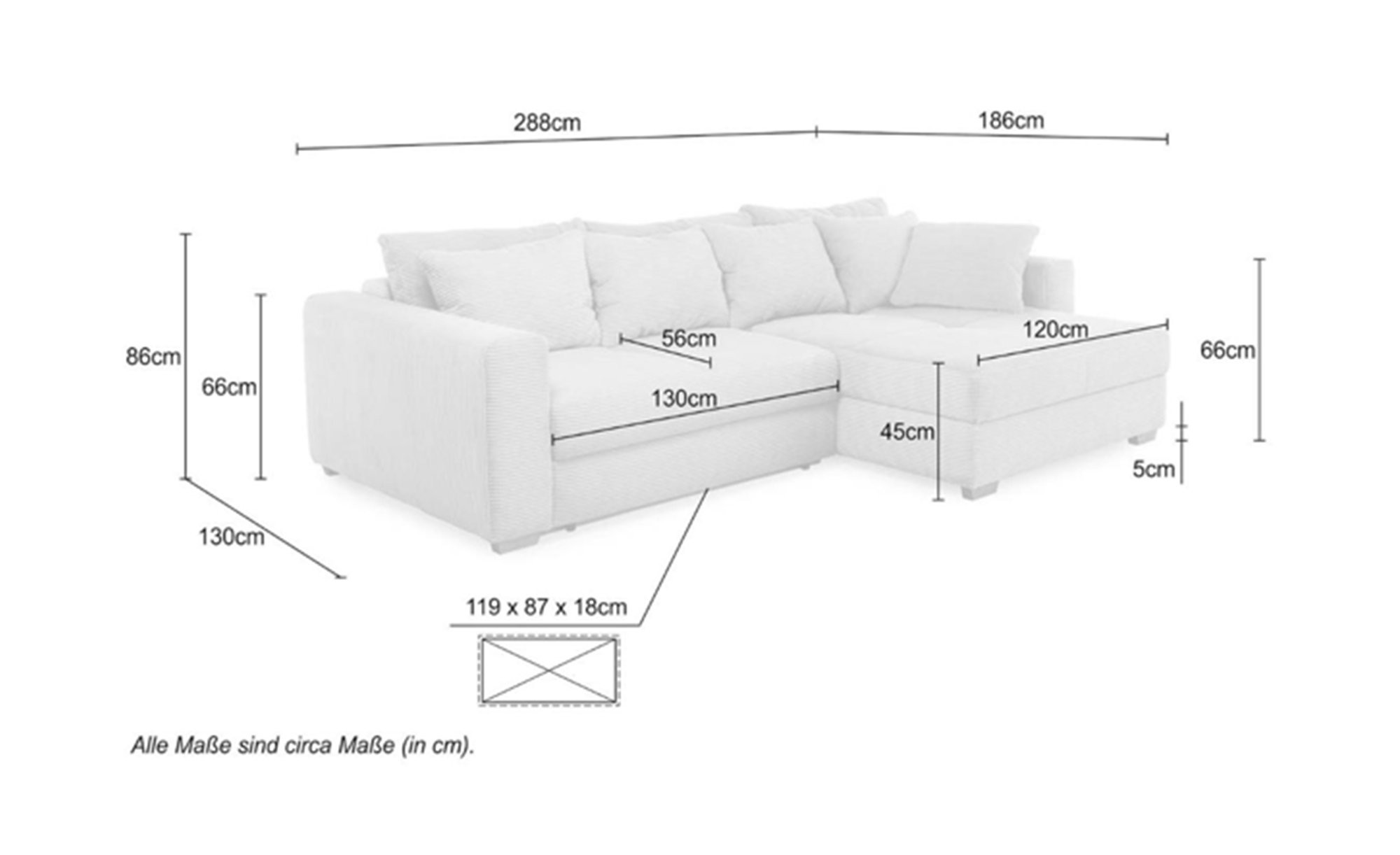 - Sitzbreite Ottomane (mit/ohne Kissen) ca. 120/164 cm