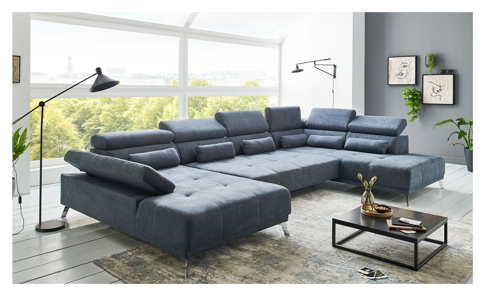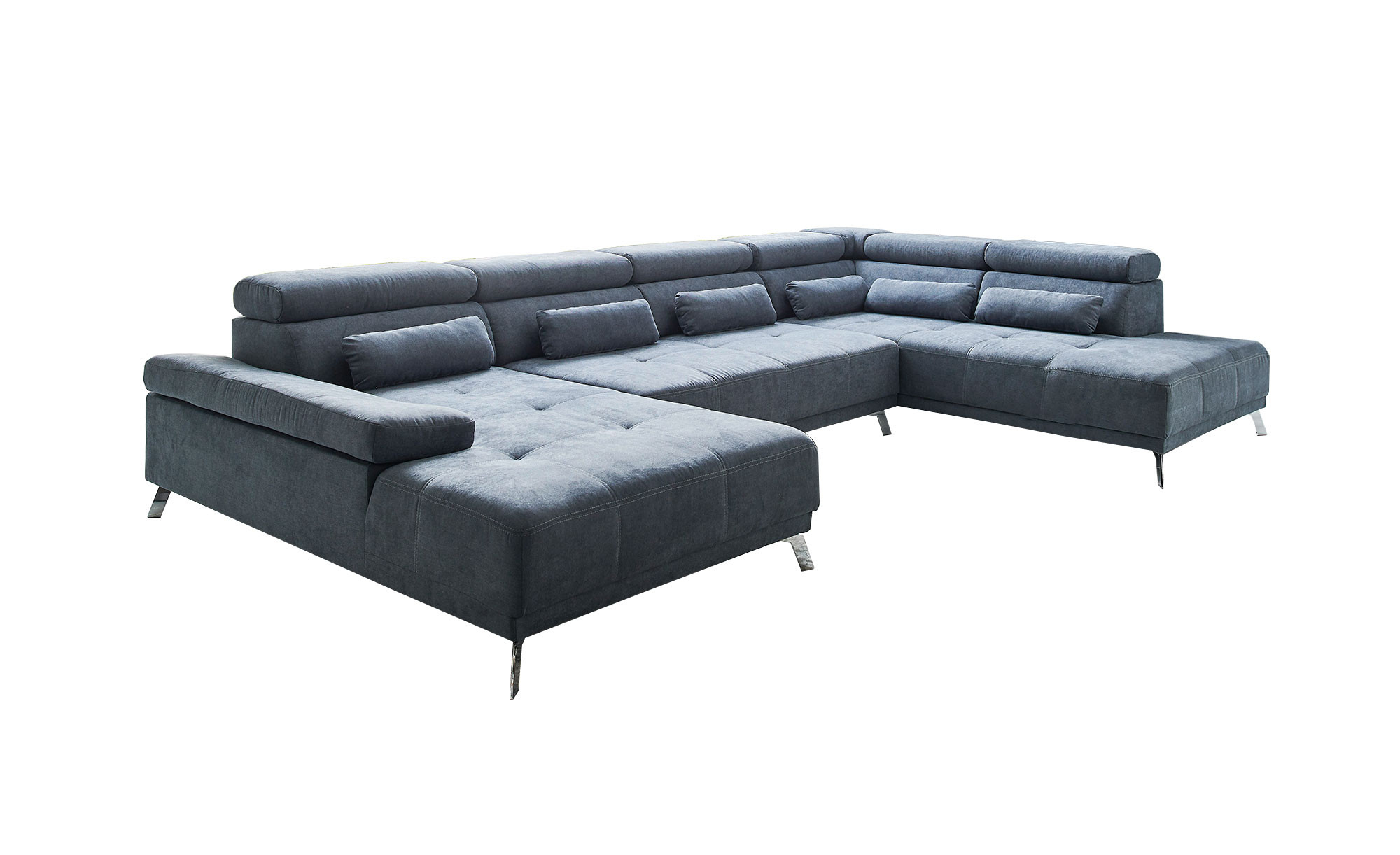 Das Sofa hinterlässt durch seinen grauen Stoffbezug und mit Metallfüßen in wahlweise in chrom, schwarz gepulvert oder verchromt, unmittelbar einen wertigen Eindruck. Der echte Rücken stellt es ihnen frei, ob Sie die Wohnlandschaft herkömmlich an einer Wand oder einfach inmitten des Zimmers platzieren möchten. Sechs Nierenkissen sind im Lieferumfang inbegriffen.