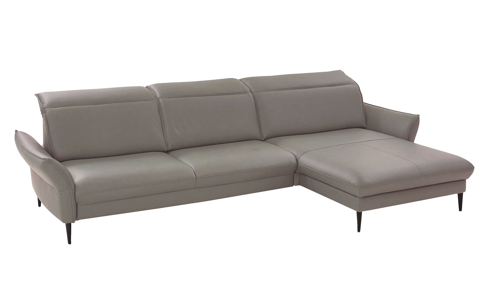 Das ca. 337 x 88-106 x 180 cm große Sofa verfügt über einen Echtleder-Bezug in der Farbe Granit, der auch den Rücken umschließt und somit vielseitige Stelloptionen ermöglicht. Schwarze Metallfüße mit einer Höhe von ca. 16 cm runden das Erscheinungsbild stilvoll ab.