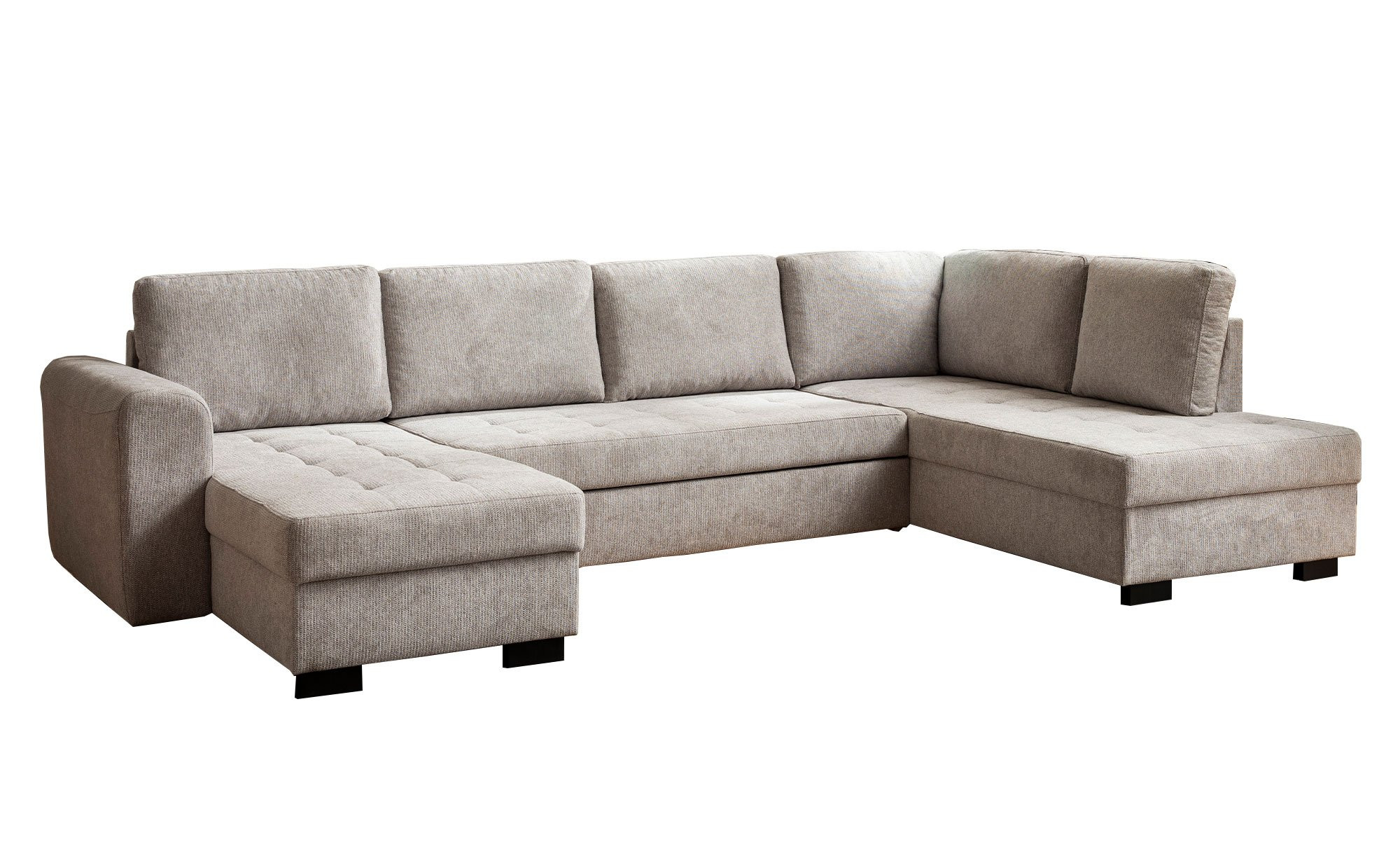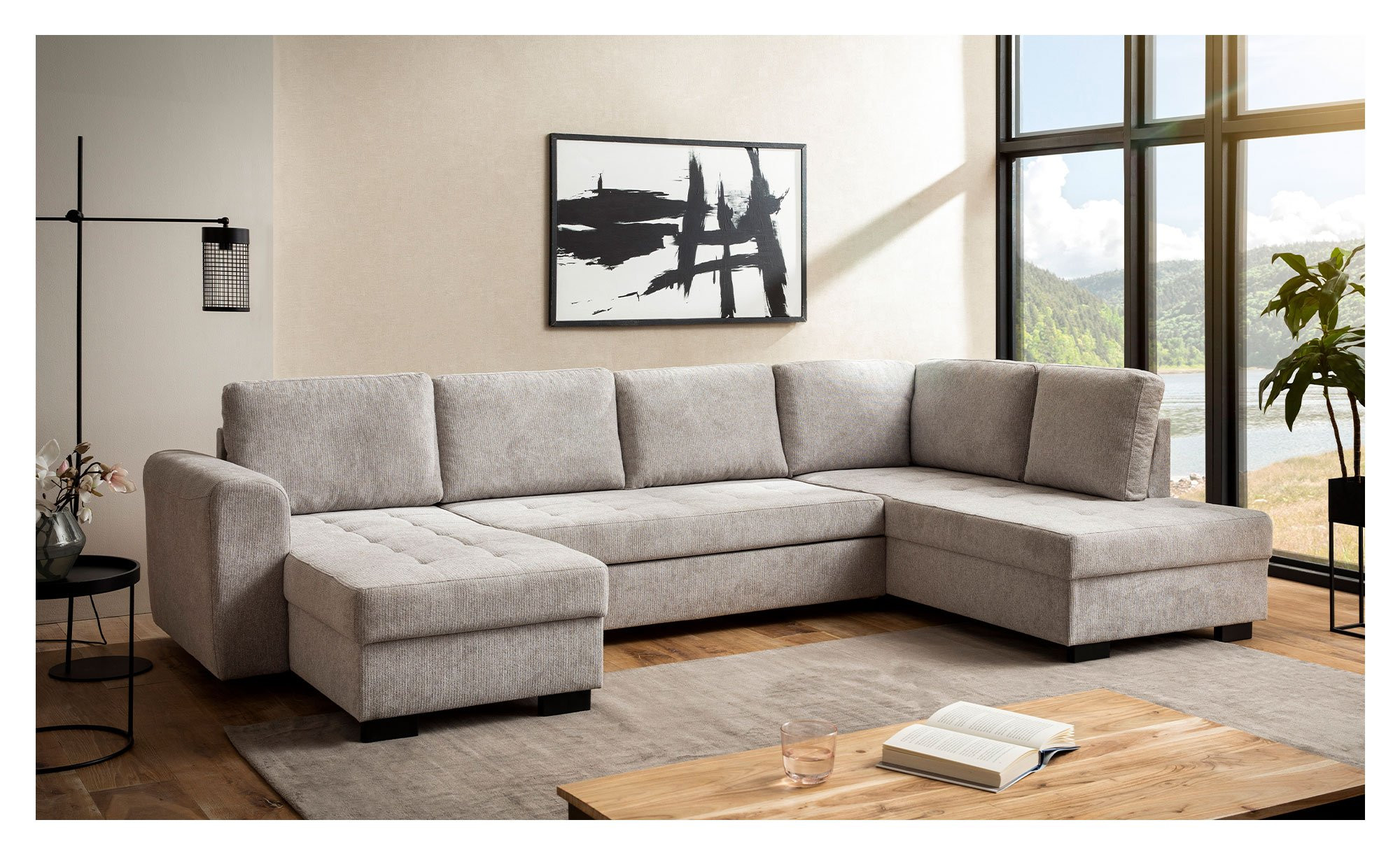 Das ca. 305 x 85 x 178 cm große Möbelstück ist mit einem grauen Cordstoff bezogen, der für eine ansprechende Atmosphäre sorgt. Da der Bezug auch am Rücken verarbeitet ist, können Sie das Sofa sowohl an der Wand als auch freistehend im Raum platzieren. Elegante schwarze Kunststofffüße runden das Gesamtbild ab.