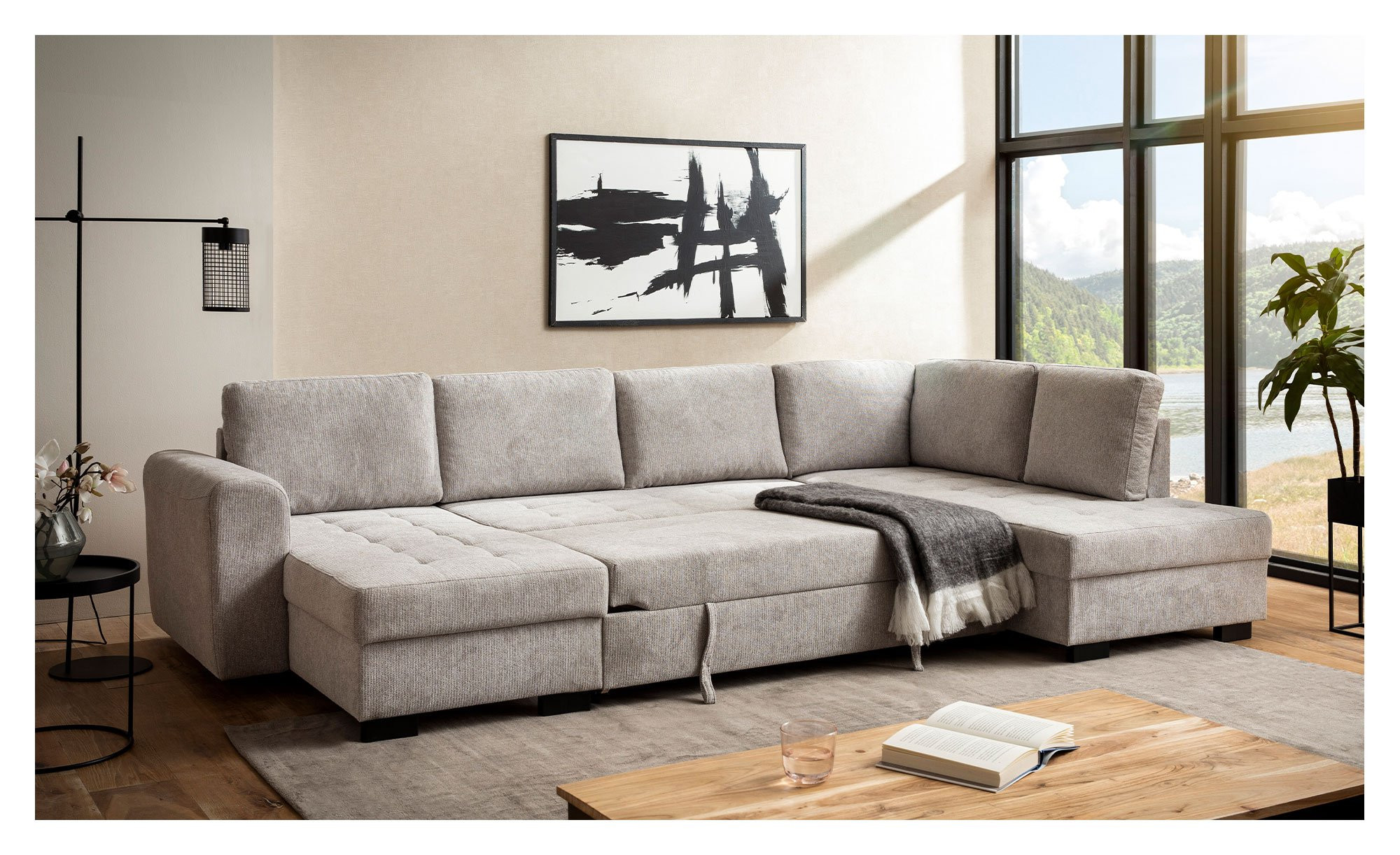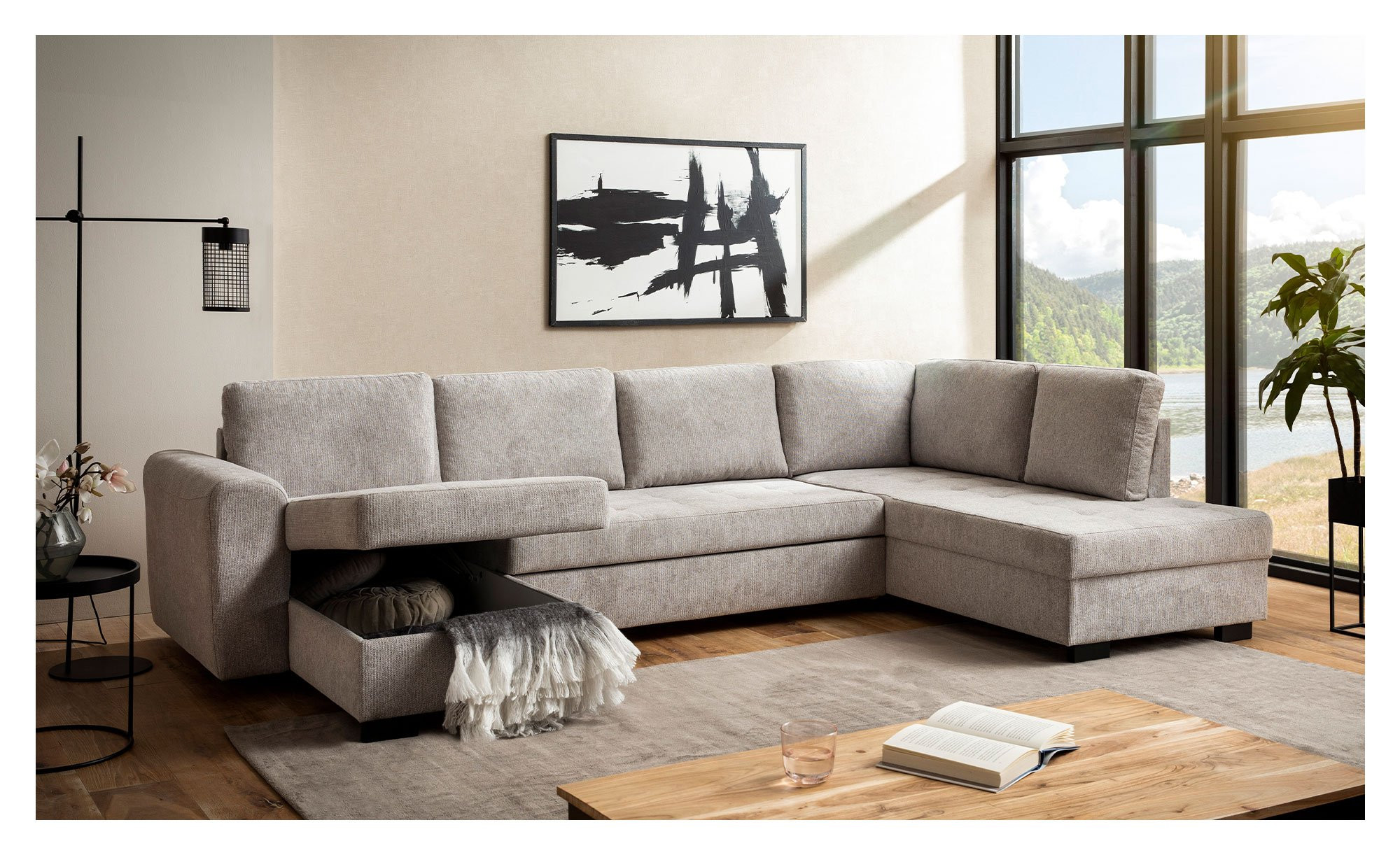 Der linke Schenkel des Sofas misst ca. 155 cm, während der rechte Schenkel eine Länge von ca. 178 cm hat. Einen praktischen Bettkasten finden Sie in der Ottomane, außerdem empfängt Sie eine nützliche Schlaffunktion.