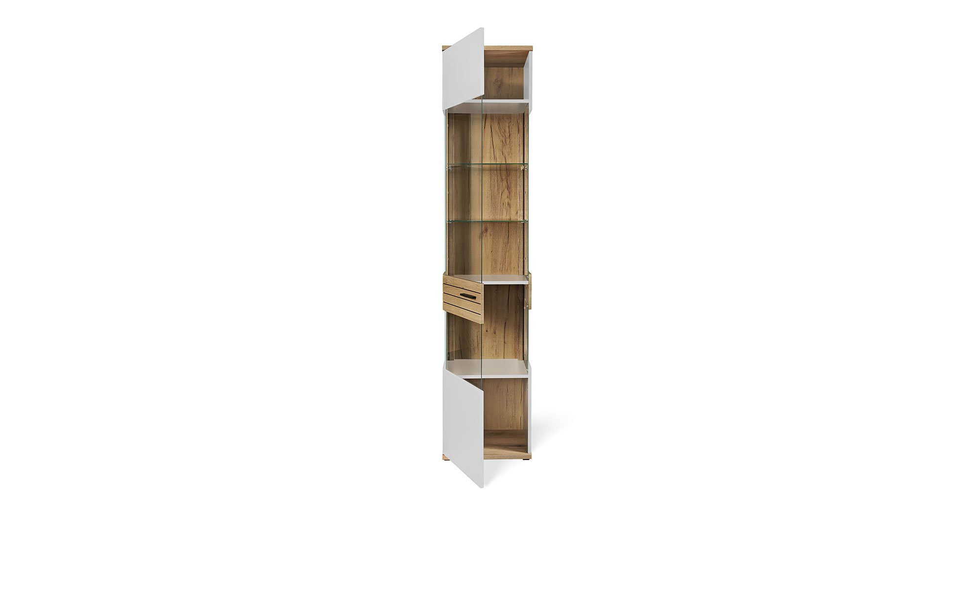 Einen gelungenen Kontrast bilden die schwarzen Füße und Metallgriffe. Die Vitrinen punkten zudem durch großzügige Klarglas-Flächen, sodass Sie hier diverse Gegenstände stilvoll präsentieren können. Dafür gibt es auch eine entsprechende Beleuchtung.